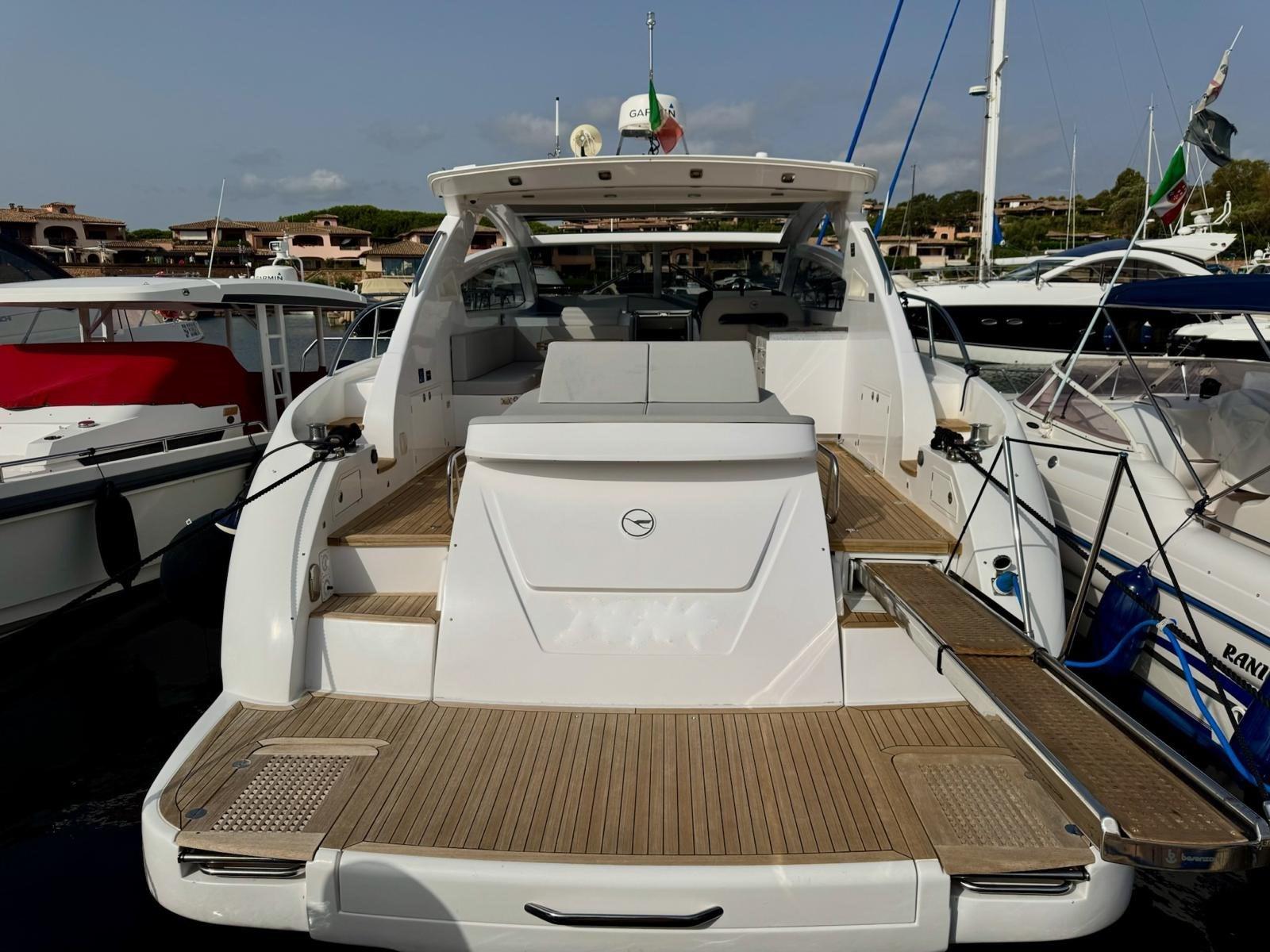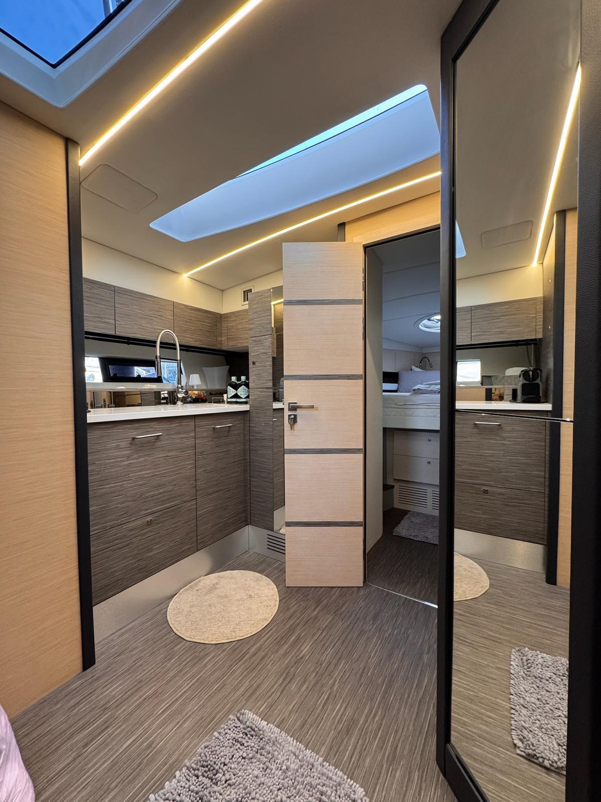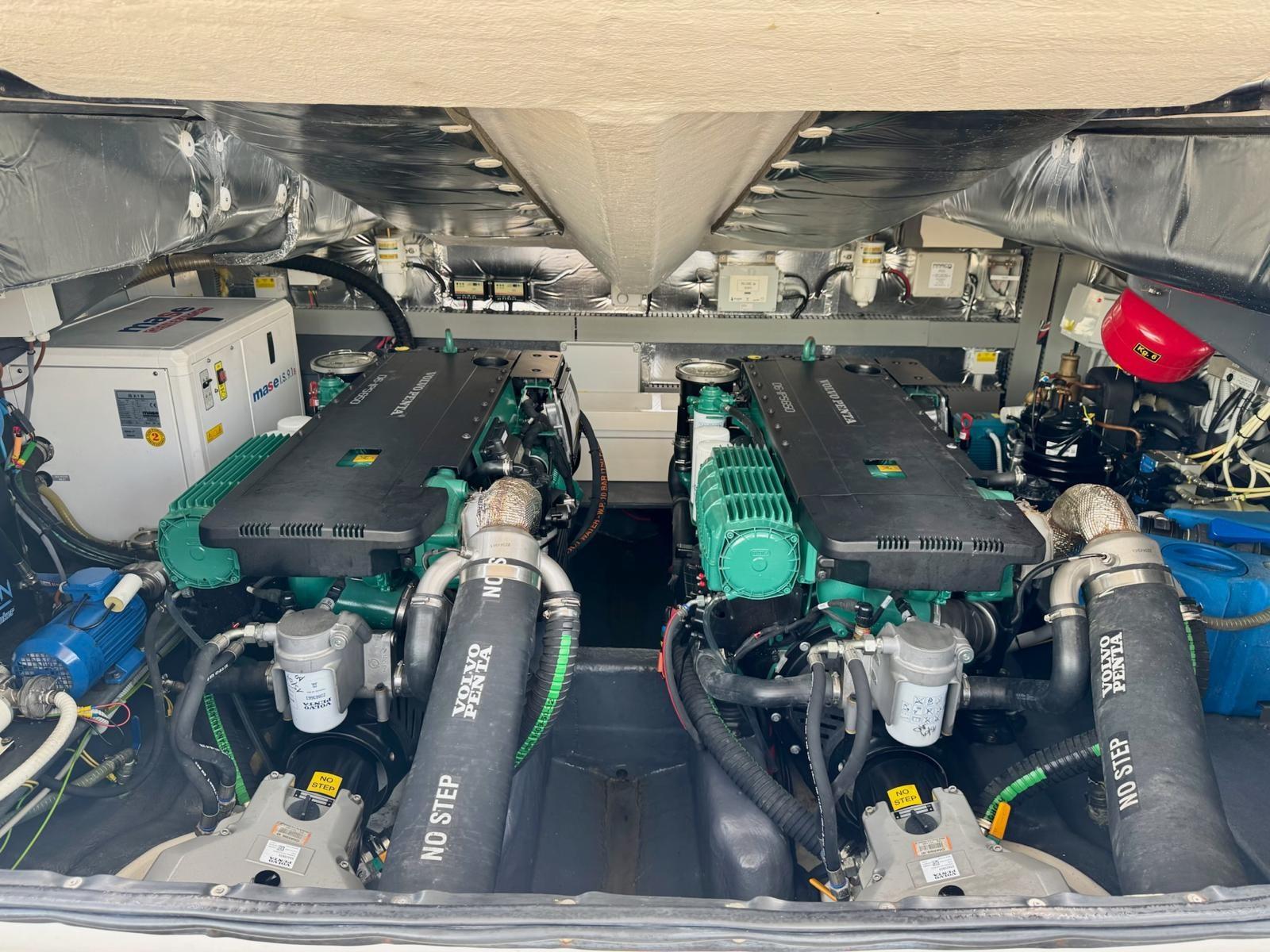 Double retractable ladder, outdoor kitchen (with sink, fridge, 4-burner induction hob and refrigerator), glass side front windshield, stainless steel pulpit with liferail and bow/stern cleats, SICIS bathroom floor, Volvo ACP galvanic current protection system, 2 12' Glass Cockpits, Volvo Interceptor with Auto Trim + Cruiser control, wireless smartphone chargers (one for each cabin), battery charger dedicated only to the generator, 60 meter stainless steel chain diameter 12 mm, kitchen cover, antifouling, metallic gray hard top paint, fuel and water inlet split on both sides