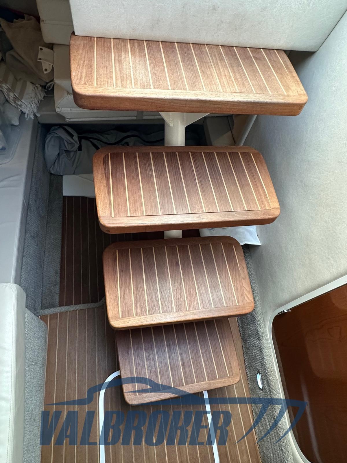 stainless steel gate at the stern, new 2023 camper closing awnings, convenient central passage in the bow, height-adjustable steering wheel, leather dinette sofa, forward cabin with oversized mattress with electric backrest, teak shower tray, heat exchanger for fresh water cooling