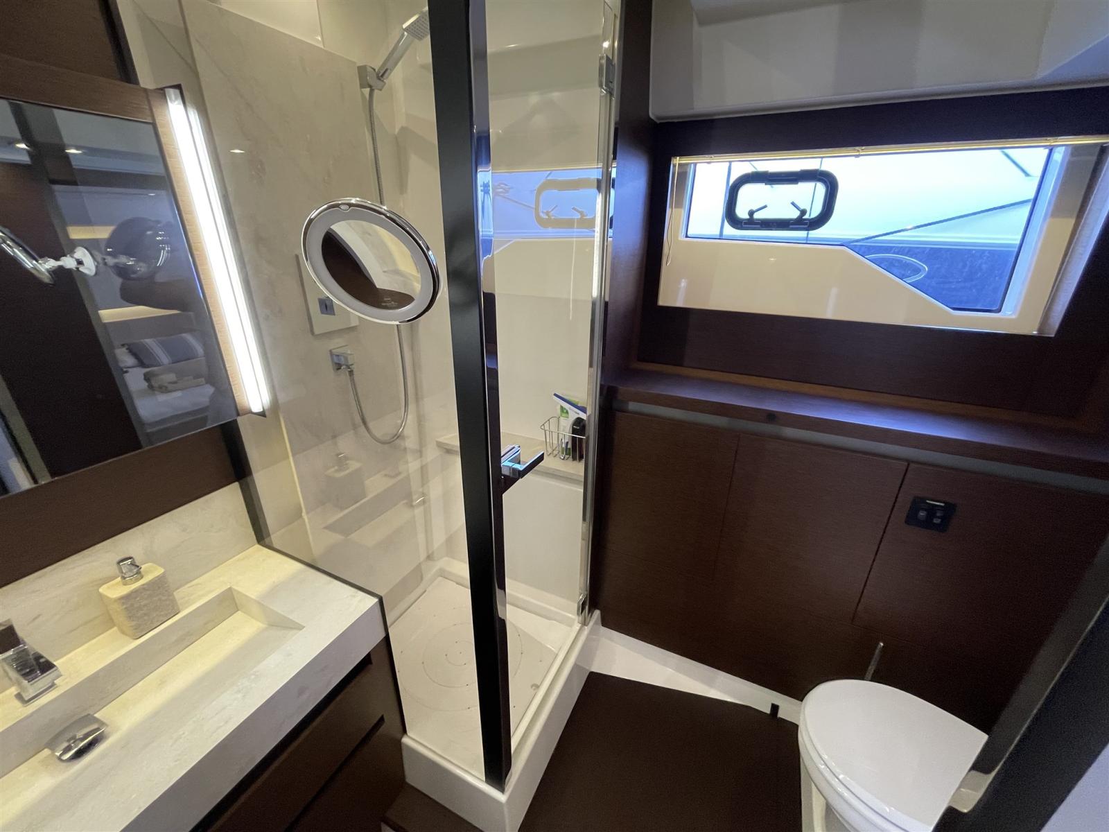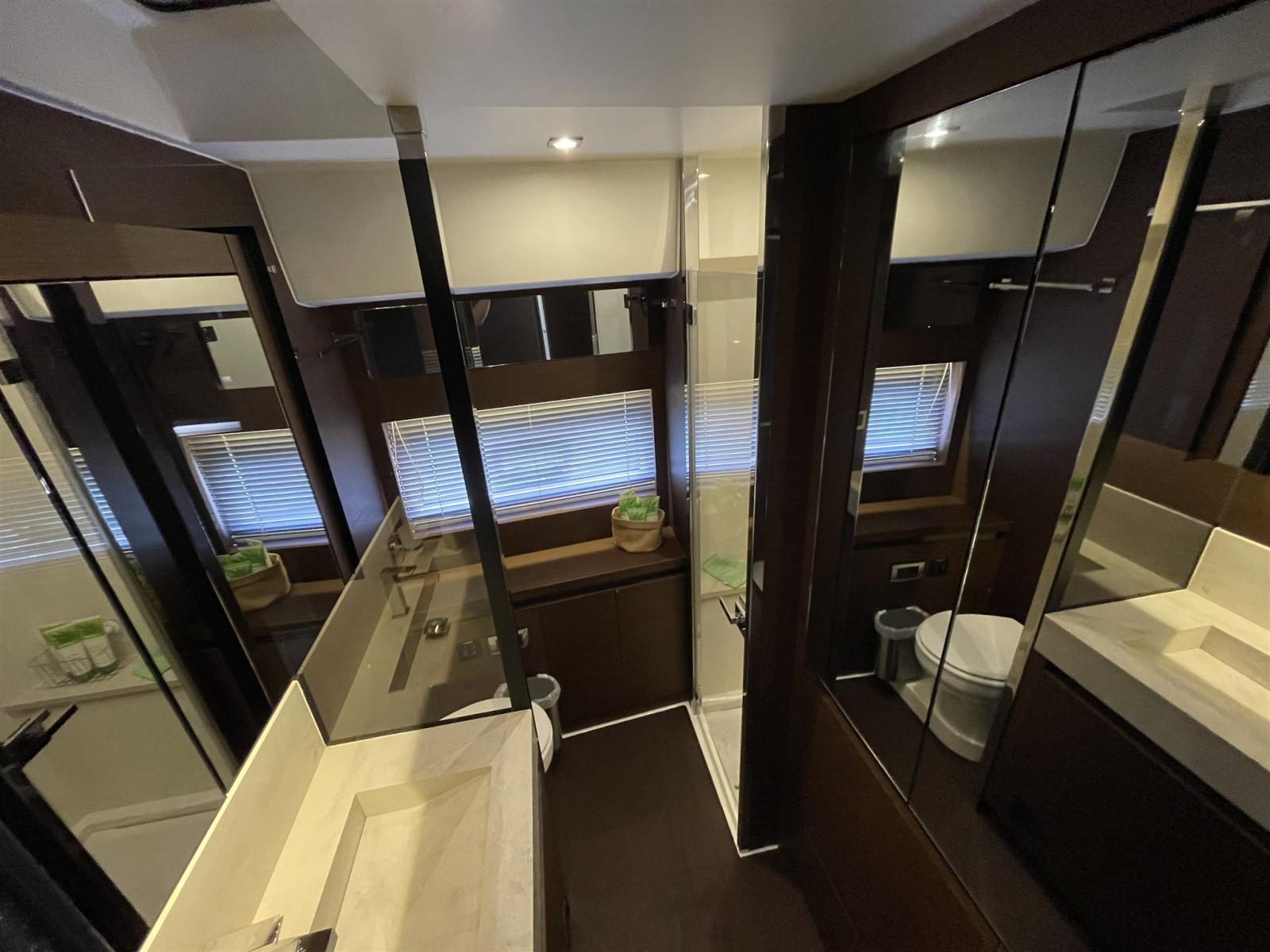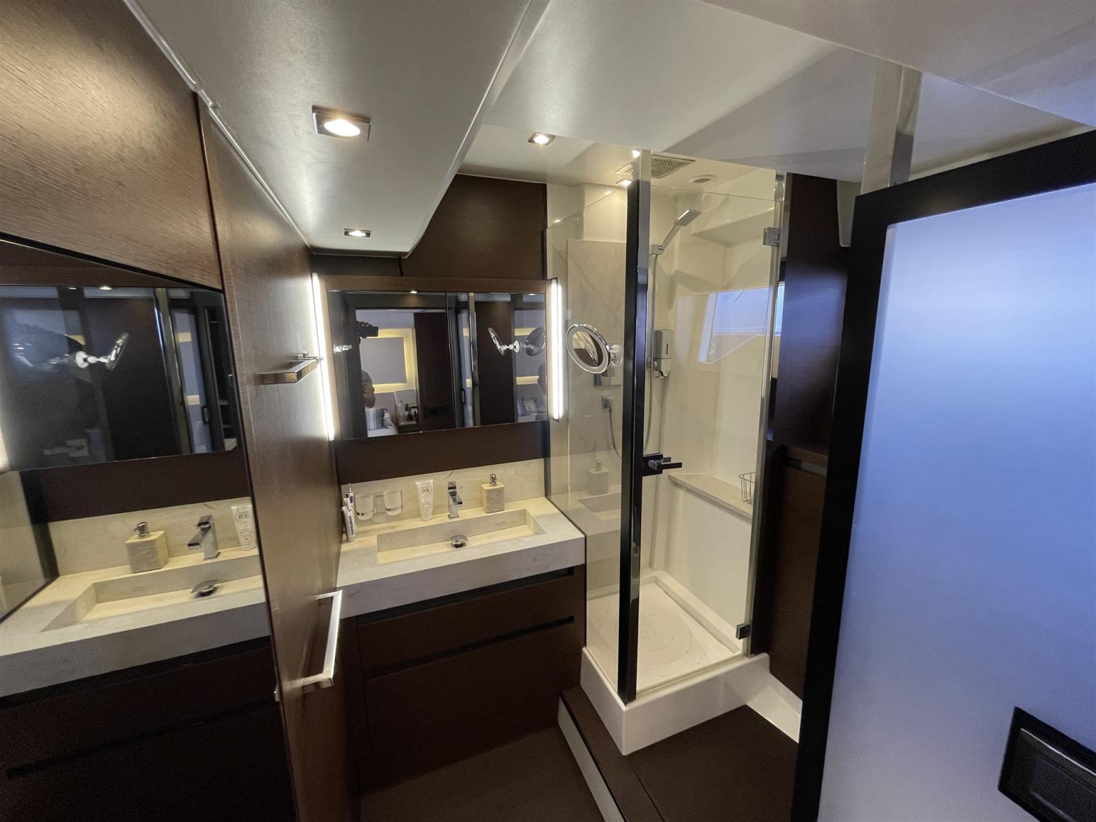 Fume/Gas Detector, Engine Alarm, Bilge Alarm, Water pressure pump, Teak Side Decks, Shore power cable, Deck Shower, Twin Steering, Directional Spotlight, Hydraulic Flaps, Fire Extinguishing System, Washbasin in the cockpit, Courtesy Lights, Underwater lights (di carena), Gangway, Platform (Affondabile), Automatic Bilge Pump, Manual Bilge Pump, Teak deck, Entry door, Teak Cockpit, Shorepower connector, Water harbor connector system (Con addolcitore e cavo di 10 m), Voltage Rectifier, Electronic instrumentation repeater, Electric Windlass, swimming ladder, Saddles for tender, Stabilizers (Seakeeper), cockpit table (x 6 comodo), Living Room Foldable Table (Modificato estenzione e abbassamento), Tender, Horn, T-Top (Nel Fly con Tenda elettrica), 2 Stern Winches.
