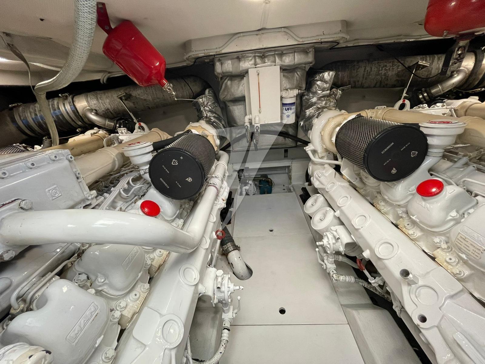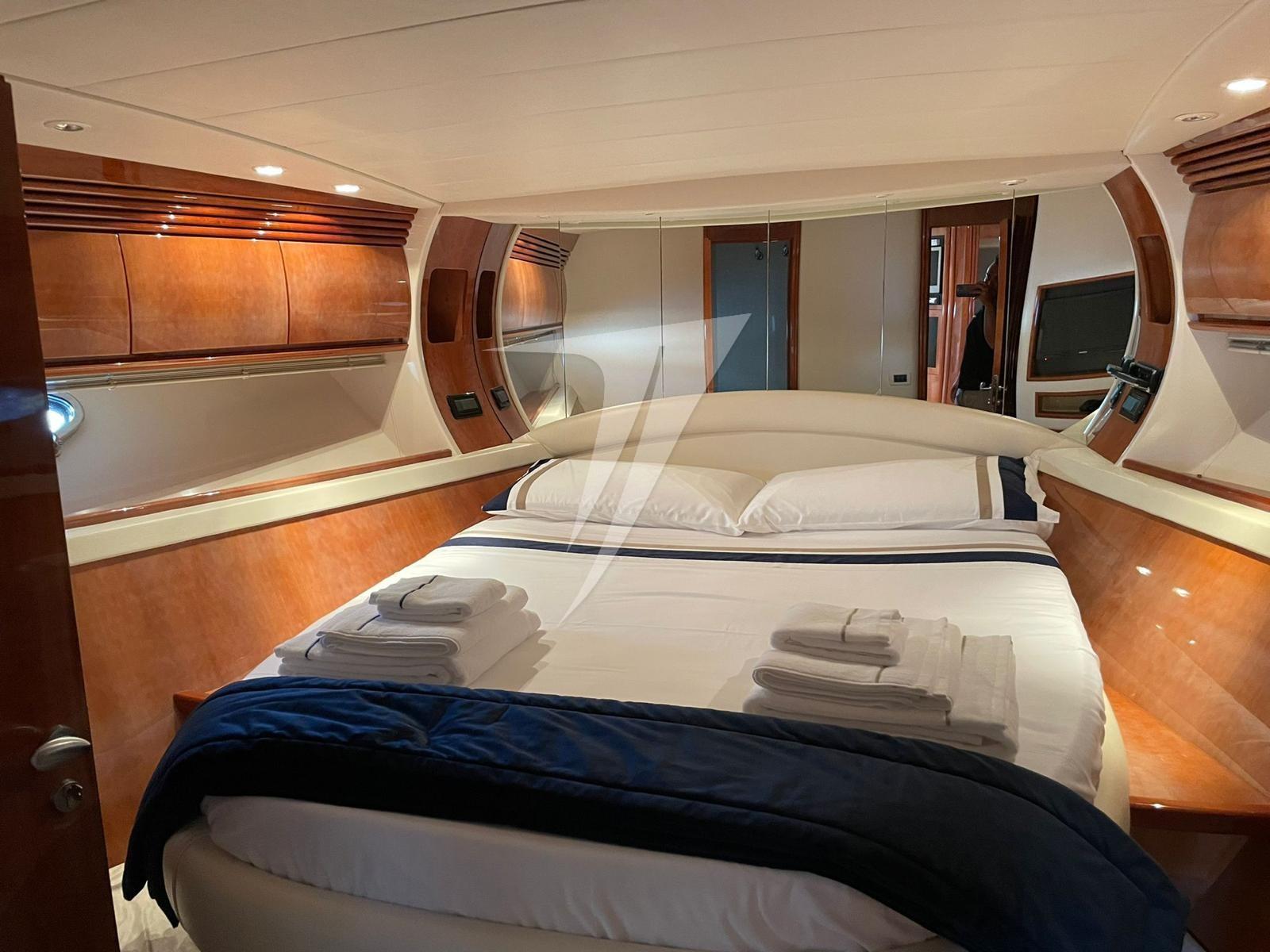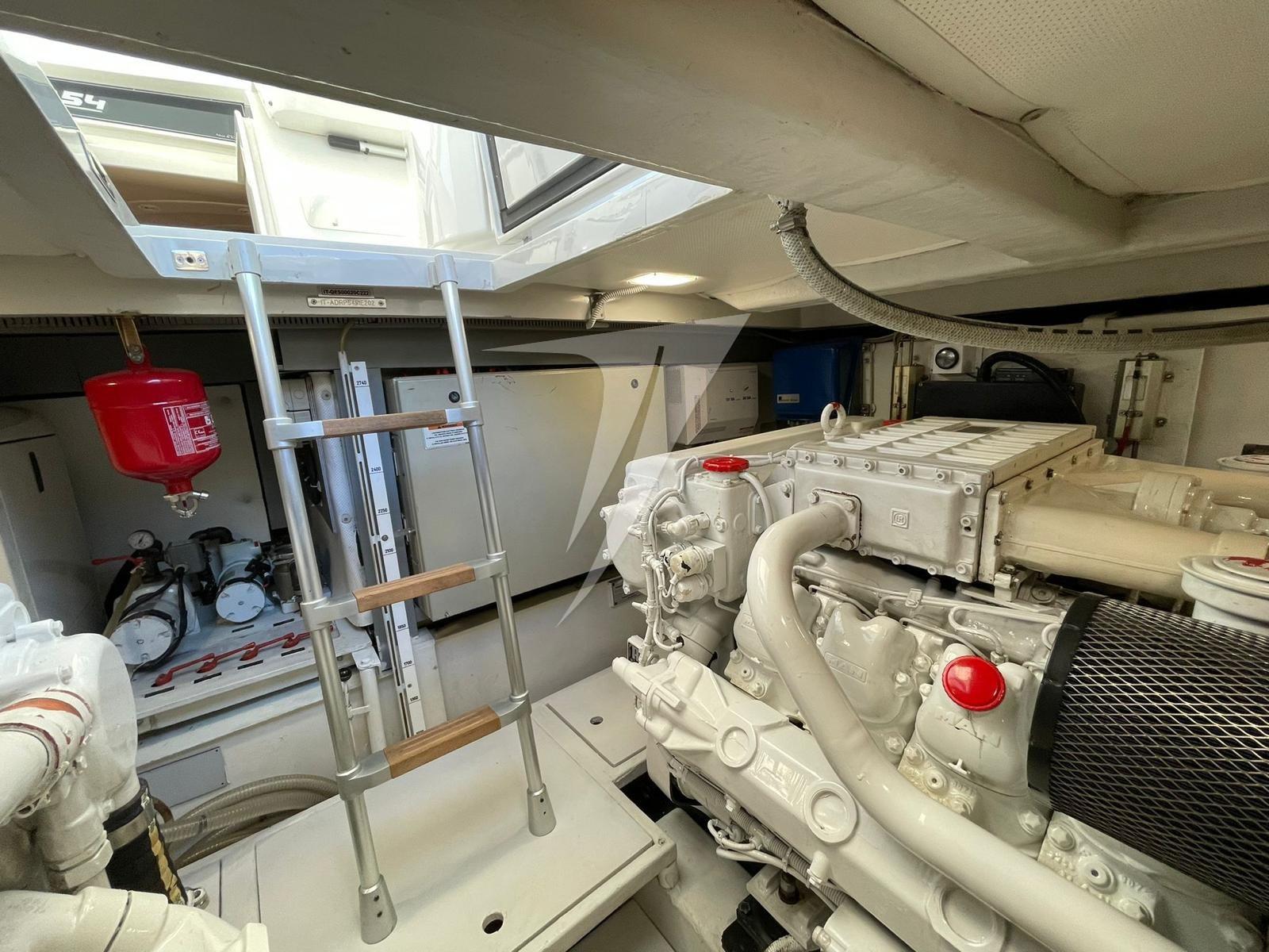 Engine Alarm, Water pressure pump, Deck Shower, Directional Spotlight, Hydraulic Flaps, Crane, Hard top (elettrico), Compressor Air System, Flaps Indicators, Washbasin in the cockpit, Courtesy Lights, Underwater lights, Gangway (idraulica), Platform (teak), Automatic Bilge Pump, Manual Bilge Pump, Teak Cockpit, Shorepower connector, Voltage Rectifier, Electric Windlass, swimming ladder, cockpit table, Living Room Foldable Table, Tender, Horn, Stern Winches.