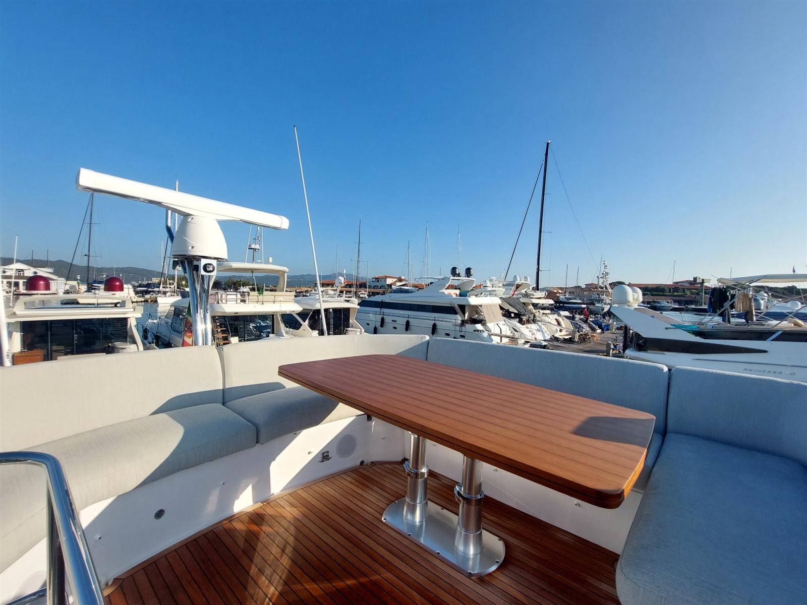 2 Engine Alarm, 4 Bilge Alarm, Alternator, 2 Water pressure pump, Auto-Trim, Teak Side Decks, Shore power cable, Special Colour (deep blue), Guard rail, Deck Shower, Twin Steering (Più stazione di poppa), Headlights fixed on the stem, Electric Flaps, Fire Extinguishing System, 2 Flaps Indicators, Anchor Chain Washdown, Washbasin in the cockpit, Courtesy Lights, Underwater lights, Outboard engine for tender (Yamaha 20cv), 6 Fenders, Gangway (Opac elettroidraulica a scomparsa), Platform (Elettroidraulica), Waste Water Tank Drain Pump, 4 Automatic Bilge Pump, Teak deck, Entry door, Teak Cockpit, Shorepower connector, Water harbor connector system, Voltage Rectifier, Electric Windlass, swimming ladder, Saddles for tender, cockpit table (in Teak), Living Room Foldable Table, Tender (Surmarine + Yamaha 20hp), guard rails with gates, Horn, Stern Winches, Bow Winches.