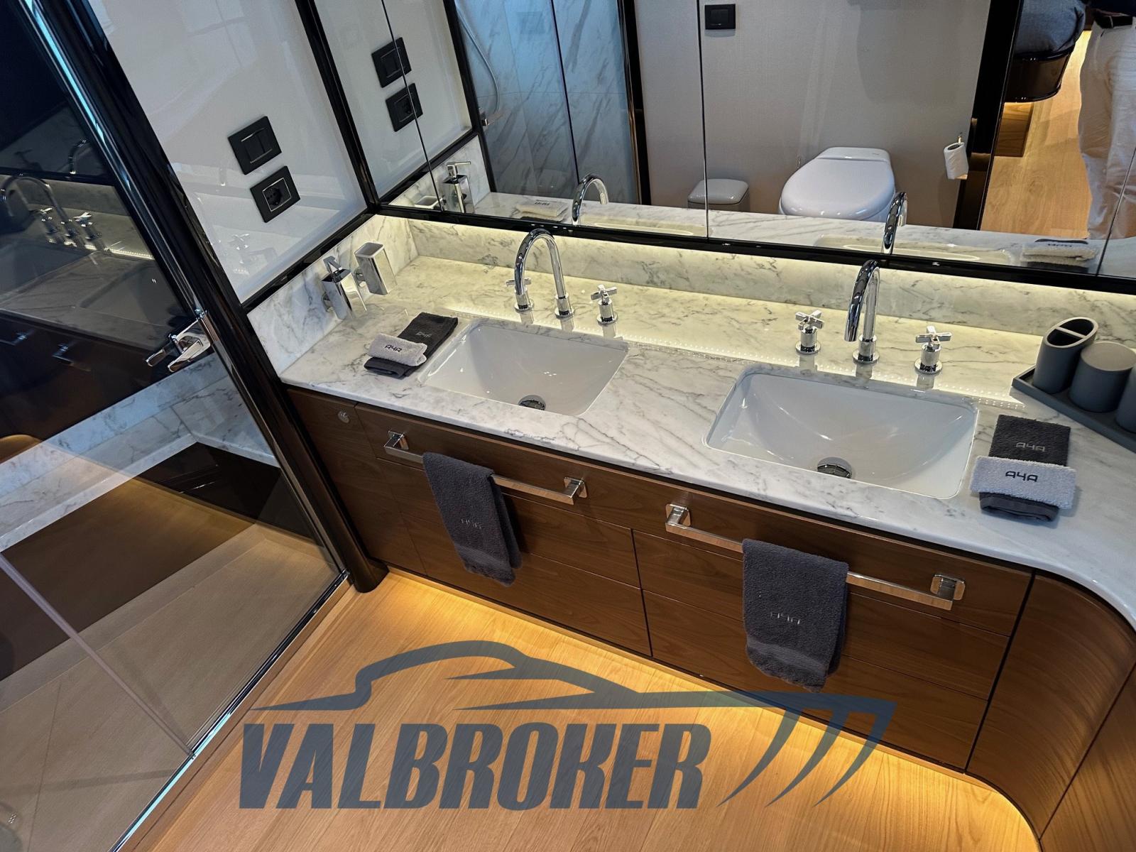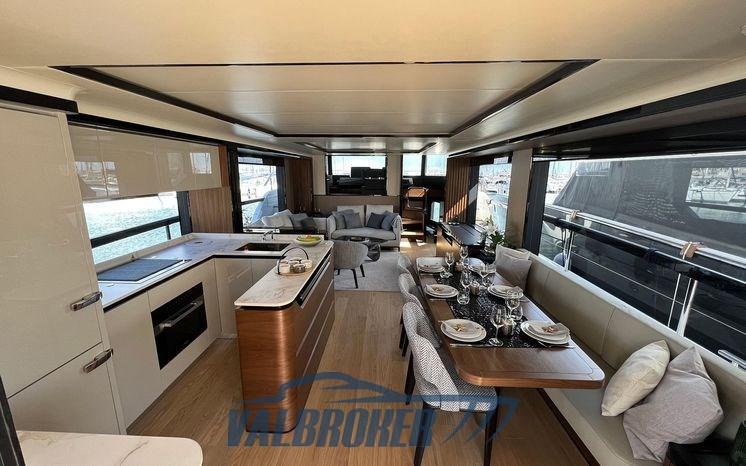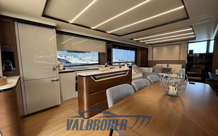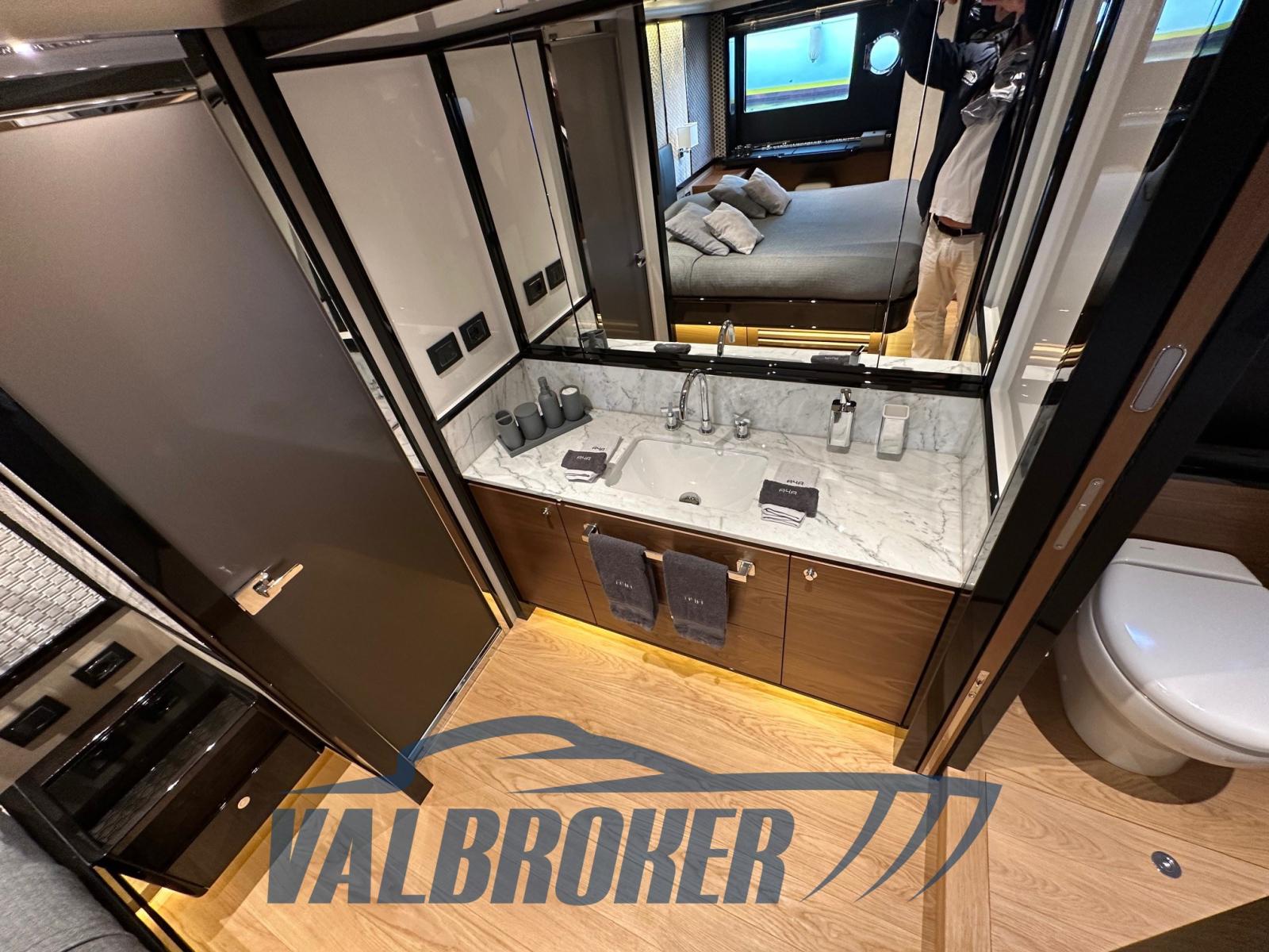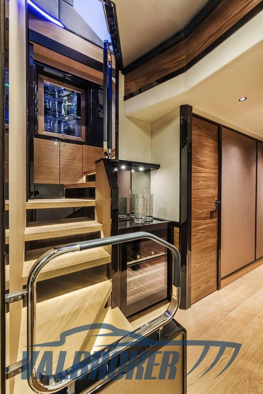 Sofa and bow sundeck shade with carbon poles, complete cover kit, teak bow table with electric leg, cover and backrest for sundeck, fly closing sheets, stern shade awning with carbon poles, Shore cable reels, gray water tank, electric blinds, Luxury interiors
