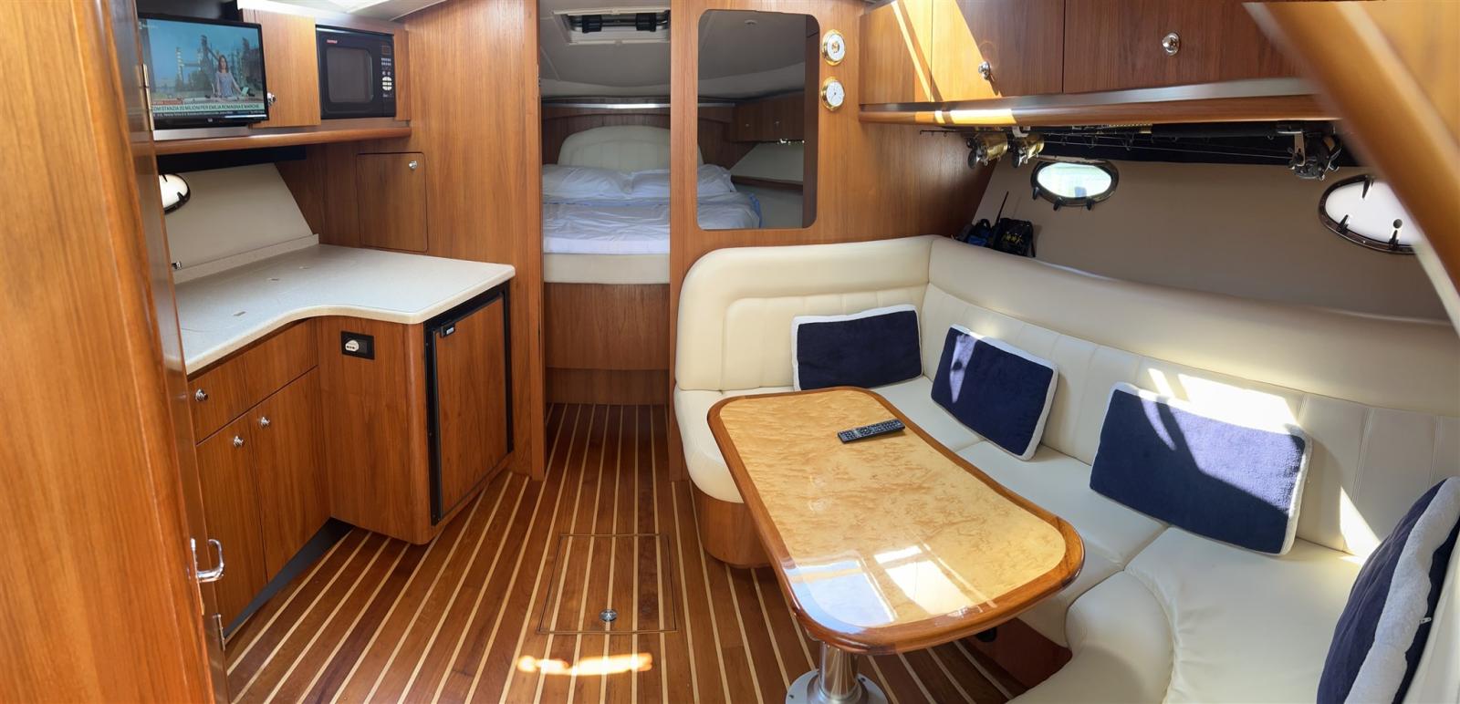 Engine Alarm, Water pressure pump, Deck Shower, Hydraulic Flaps, Hard top, Fire Extinguishing System, Flaps Indicators, Washbasin in the cockpit, Courtesy Lights, Platform, Automatic Bilge Pump, Manual Bilge Pump, Entry door, Shorepower connector, Water harbor connector system, Electric Windlass, swimming ladder, cockpit table, Living Room Foldable Table, Horn.