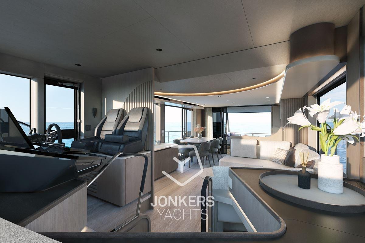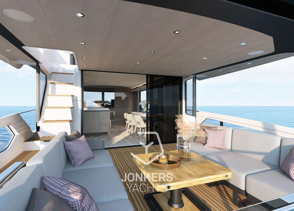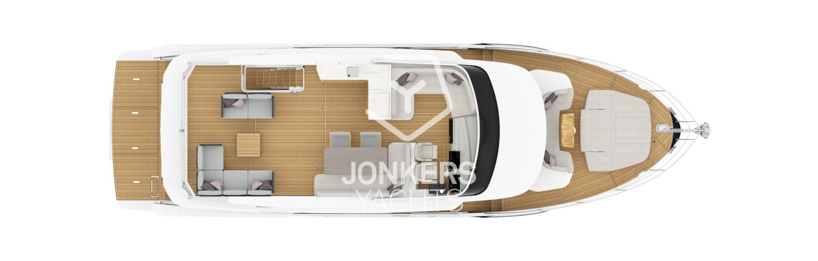Among its most distinctive features are the signature squircle-shaped bow windows, glass bulwarks in the cockpit that provide unobstructed sea views and enhanced safety, and the truncated transom design, which eases access to the water. The cockpit, fully sheltered by the flybridge, is spacious and versatile, customizable with modular sofas, while the large stern platform is available in a fixed version or with an integrated automatic ladder.