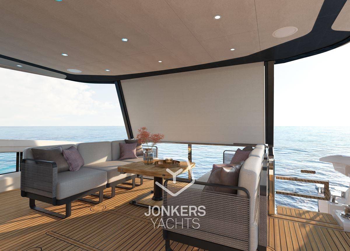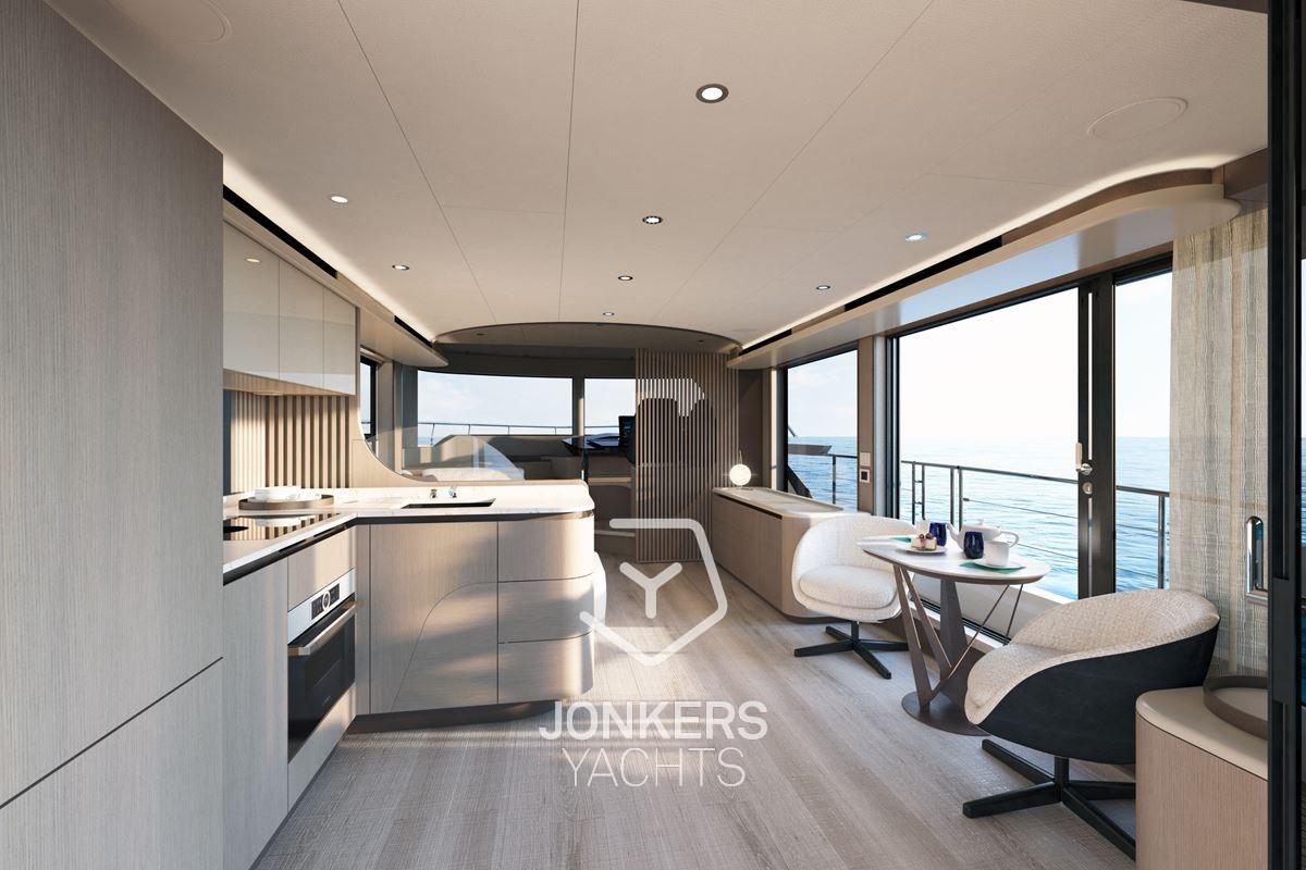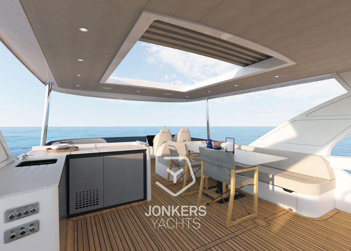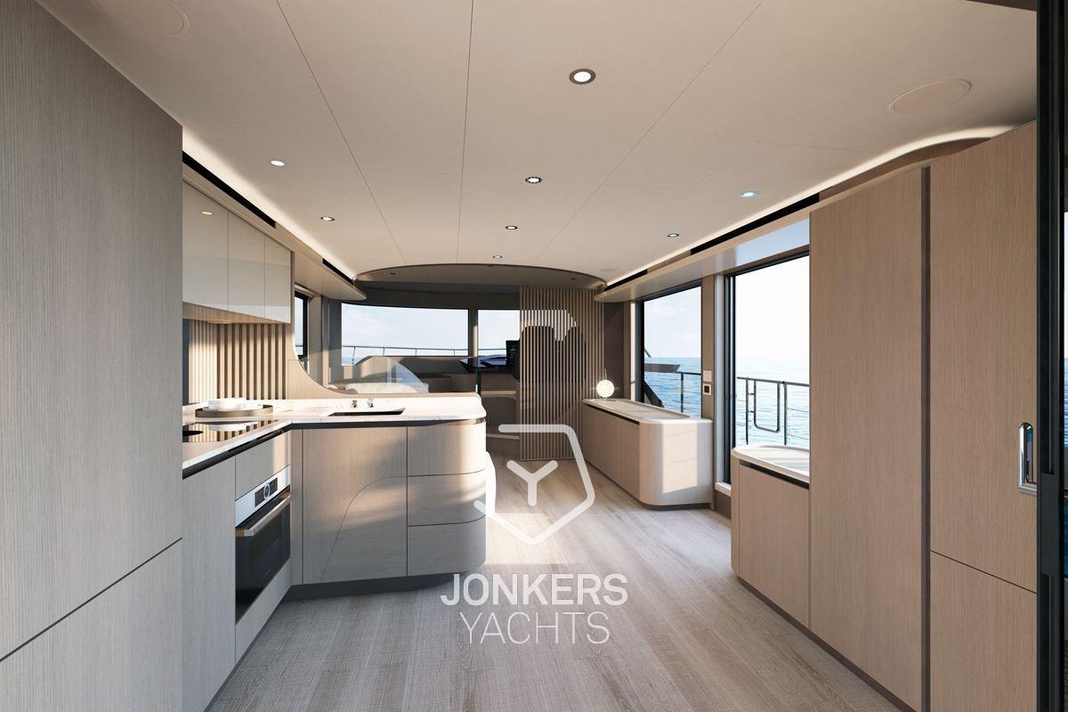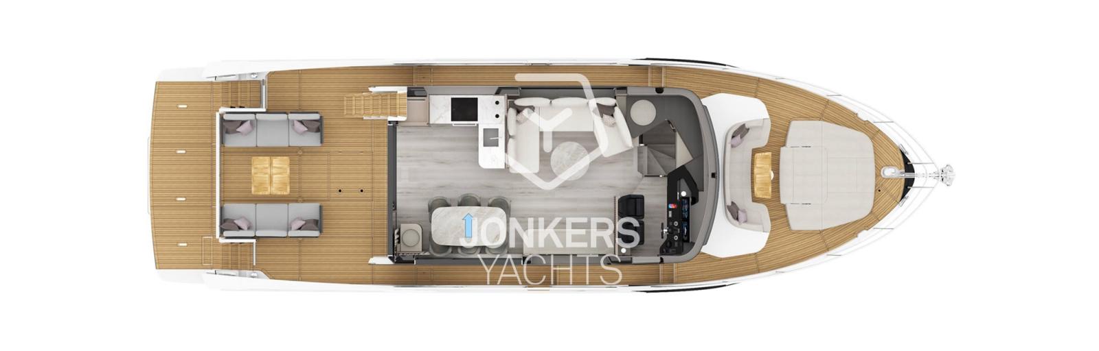 The step-free flybridge offers a customizable aft terrace, a generous L-shaped sofa with sliding ceramic table, a fully equipped wet bar with BBQ, refrigerator, icemaker, and freezer, plus a starboard helm station designed to simplify docking manoeuvres. The expansive hardtop, available with an opening section or solar panels, completes the space with dimmable ceiling lights and integrated floor lighting, creating a refined and atmospheric onboard experience.