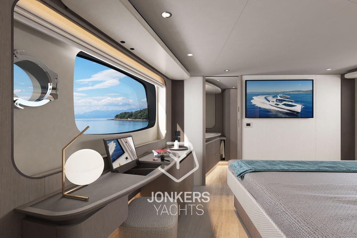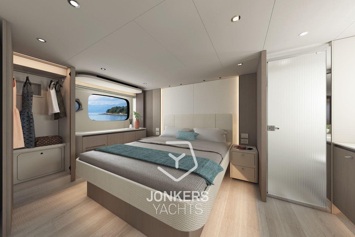 The full-beam master cabin forward is bright and spacious, with a walk-in closet and customizable furnishings; the midship VIP cabin offers the same level of comfort with an en-suite bathroom and large panoramic windows; the guest cabin features two single beds that can be electrically converted into a double.