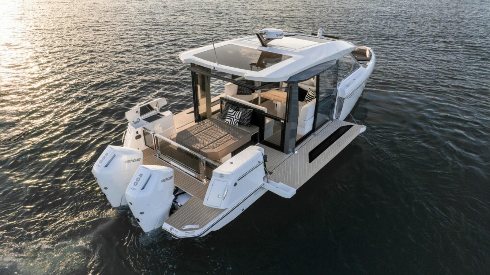 The Saxdor 400 GTC is designed for dual outboard engines and uses an exclusive naval architecture, ensuring a memorable sailing experience. The main deck features an innovative design with a full-width wheelhouse, optimising interior space. Compared to the GTO, the GTC adds a touch of luxury thanks to the large insulated glass surfaces, which create a bright and welcoming environment, protected from the elements. The layout allows for a direct connection to the side terraces, for a relaxation experience similar to a private island. Below deck, two stairs lead to the double cabins – forward and amidships – which share a bathroom; An optional third bed for children is also available. Every detail is designed with elegance and functionality. Contact us for more information.