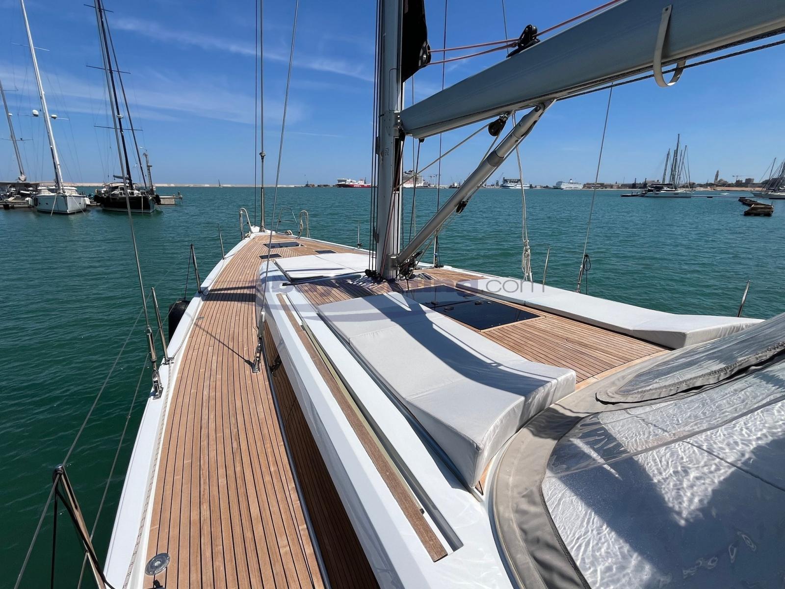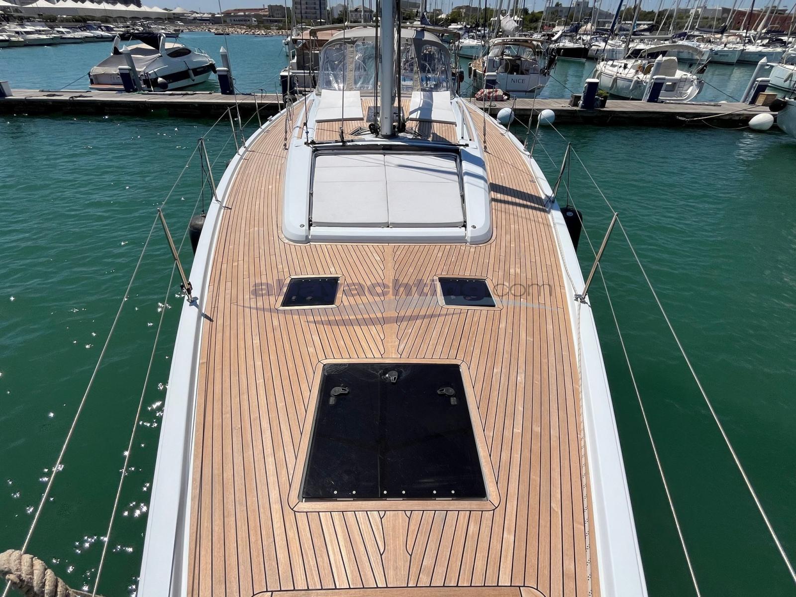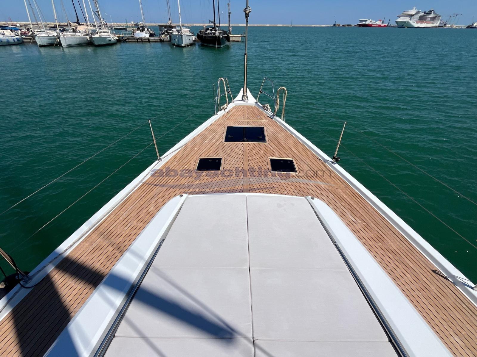 Anchor (DELTA 25KG + CATENA 125 MT), Spare shaft, Water pressure pump, 6 Batteries, Teak Side Decks, Deck Shower, Twin Steering, Bow Thruster (RETRATTILE), Gangway (IN CARBONIO), Platform (ELETTRICA), Manual Bilge Pump, Teak Cockpit, Shorepower connector, Electric Windlass (Salpa ancora elettrico da 1500W con comando ripetuto in pozzetto e contametri), Rod rigging, swimming ladder, Outboard Engine Support Bracket, cockpit table, Teak Deckhouse, 4 Winch (2 ELETTRICI HARKEN RADIAL MAGGIORATI 60" + 2 DA 50).