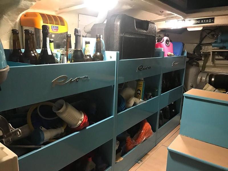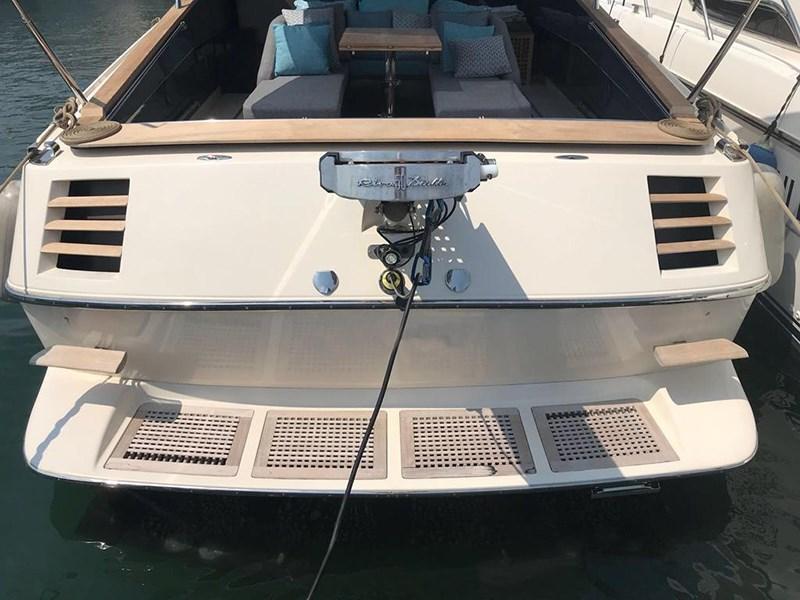 Navigation lights; Cockpit courtesy lights; Submerged transom lights; Bow thruster; Anchor winch; Hydraulic gangway with embossed Riva logo; Teak stern platform; Carbon T-top; Aft awning; Cockpit cushions; Satellite TV; dishwasher; Boiler; Tender with FB engine; Mase generator (20h); Batteries; Cockpit shower.