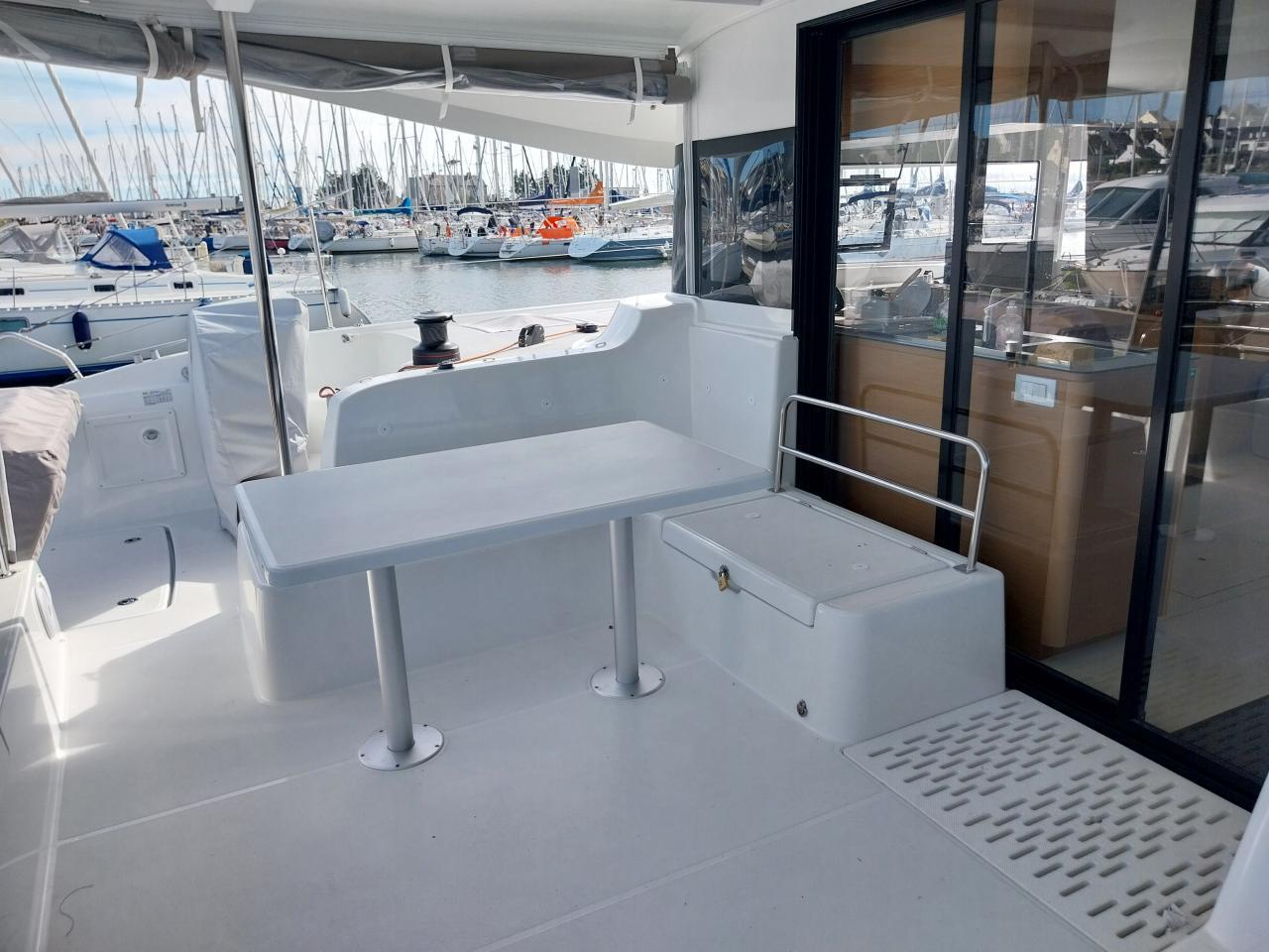 Outside saloon with port L-shaped bench seat and fiber cockpit table