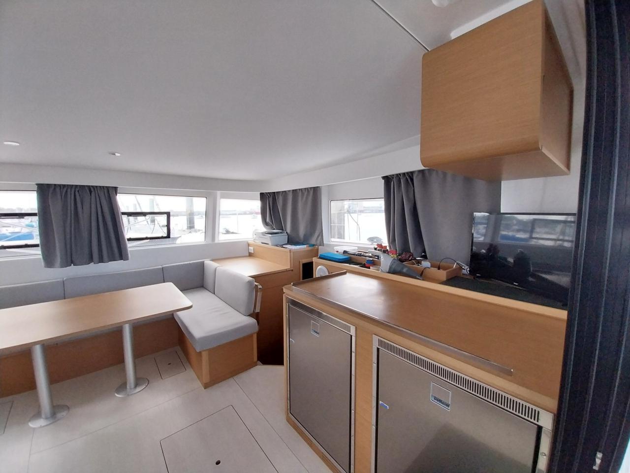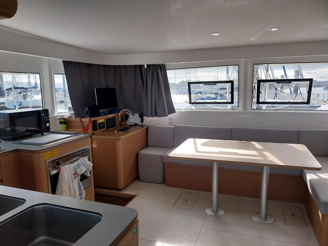 Saloon table forward to starboard with L-shaped bench seat