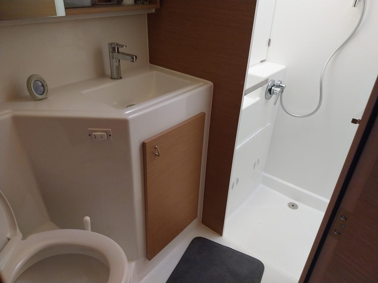 Two shower rooms with washbasin, electric toilet with 80 L holding tank and separate shower