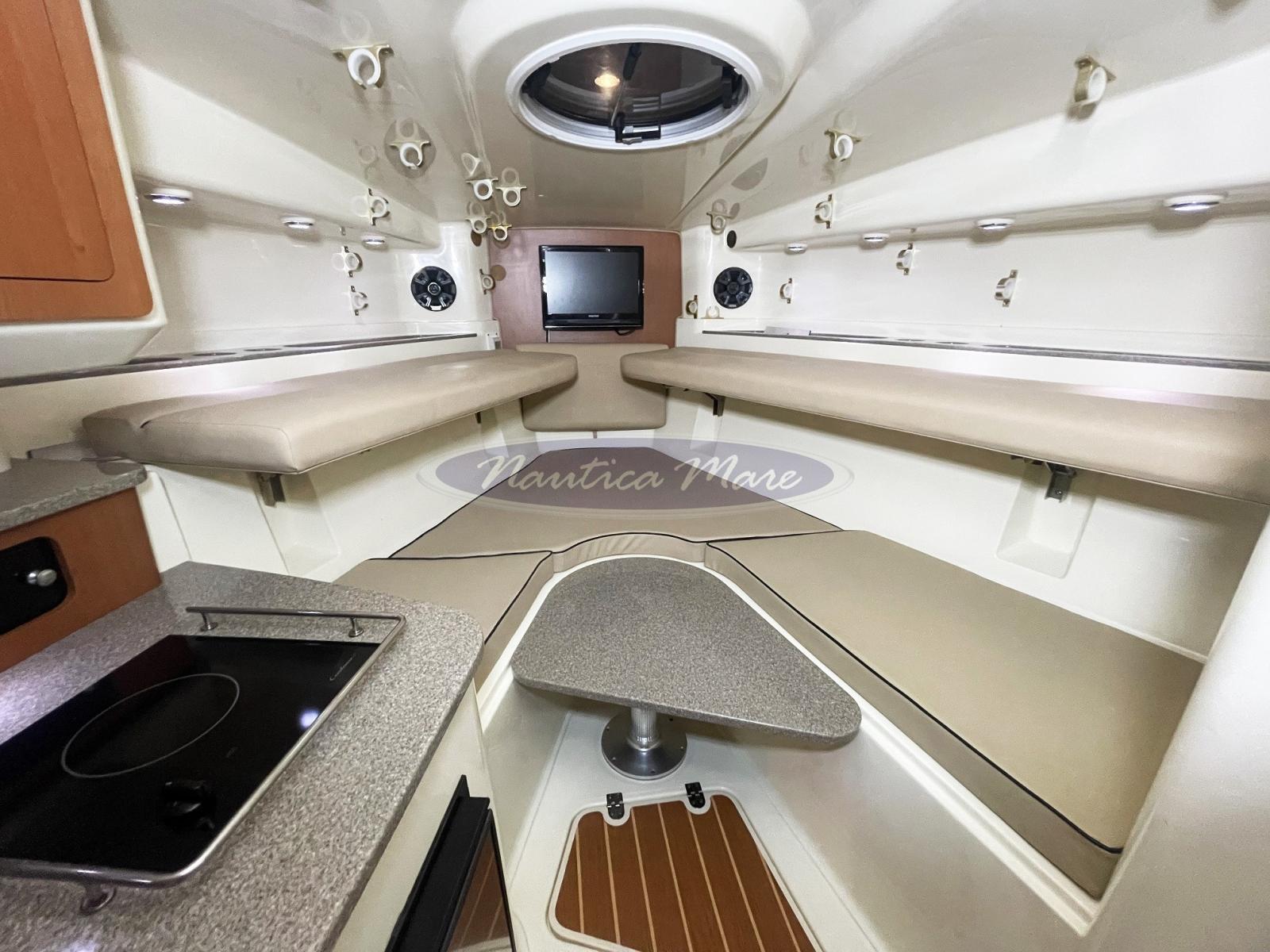 Anchor (inox con catena zincata), Water pressure pump, 3 Batteries, Shore power cable, Special Colour (scafo celeste), Safety rail, Deck Shower, Headlights fixed on the stem, Directional Spotlight, Electric Flaps (Lenco con indicatori in plancia), Hard top (vetroresina e alluminio), Flaps Indicators (in plancia), Washbasin in the cockpit (con piano di lavoro), Courtesy Lights, Fenders, Automatic Bilge Pump, Deck Wash Pump, Seawater Pump, Entry door (tuna door a poppa sinistra e porta accesso cabina con gradini integrati per passaggio a prua), Shorepower connector, Water harbor connector system, Electric Windlass (Lewmar 1000 W), swimming ladder (a poppa), Living Room Foldable Table, Horn.