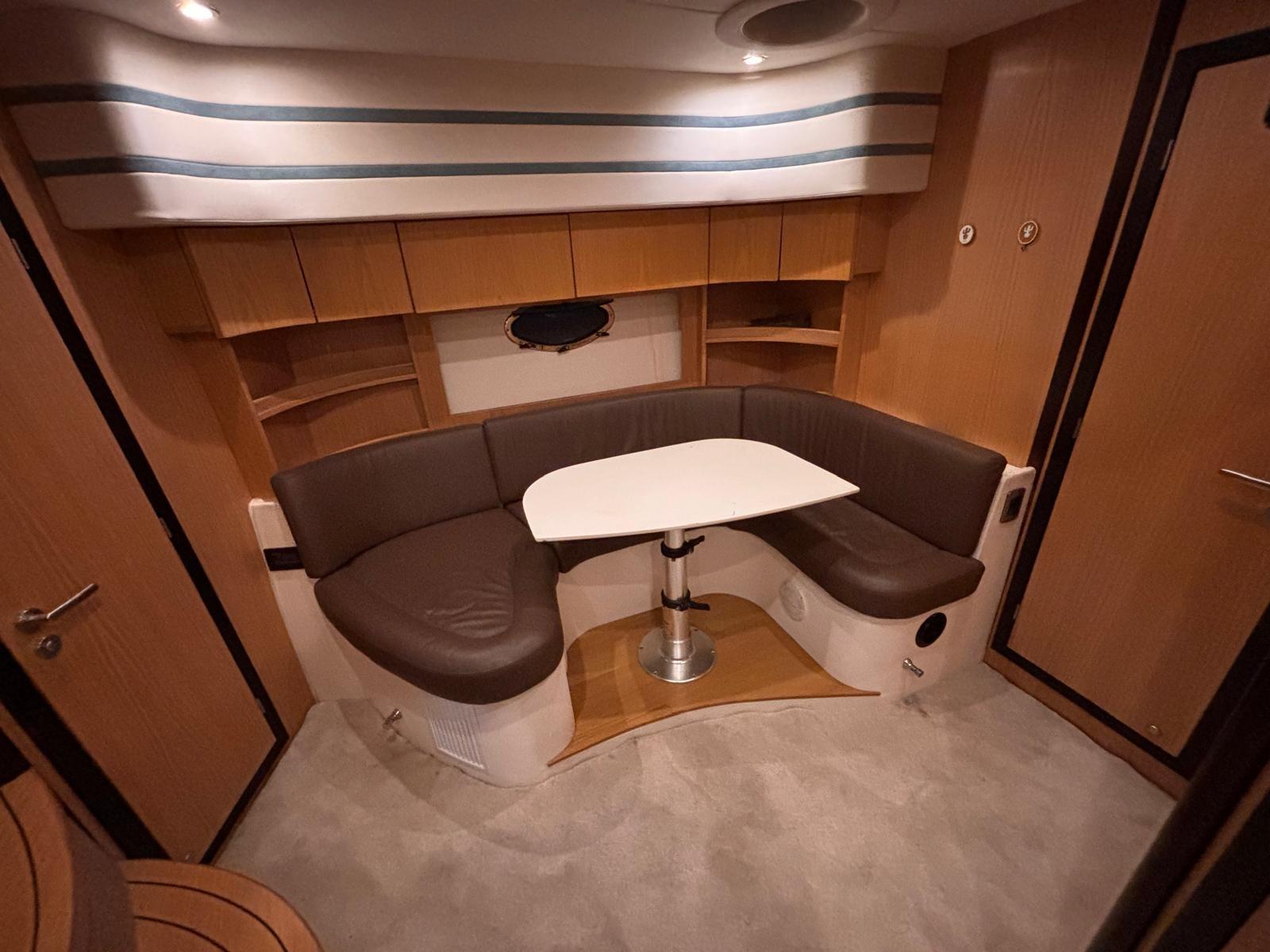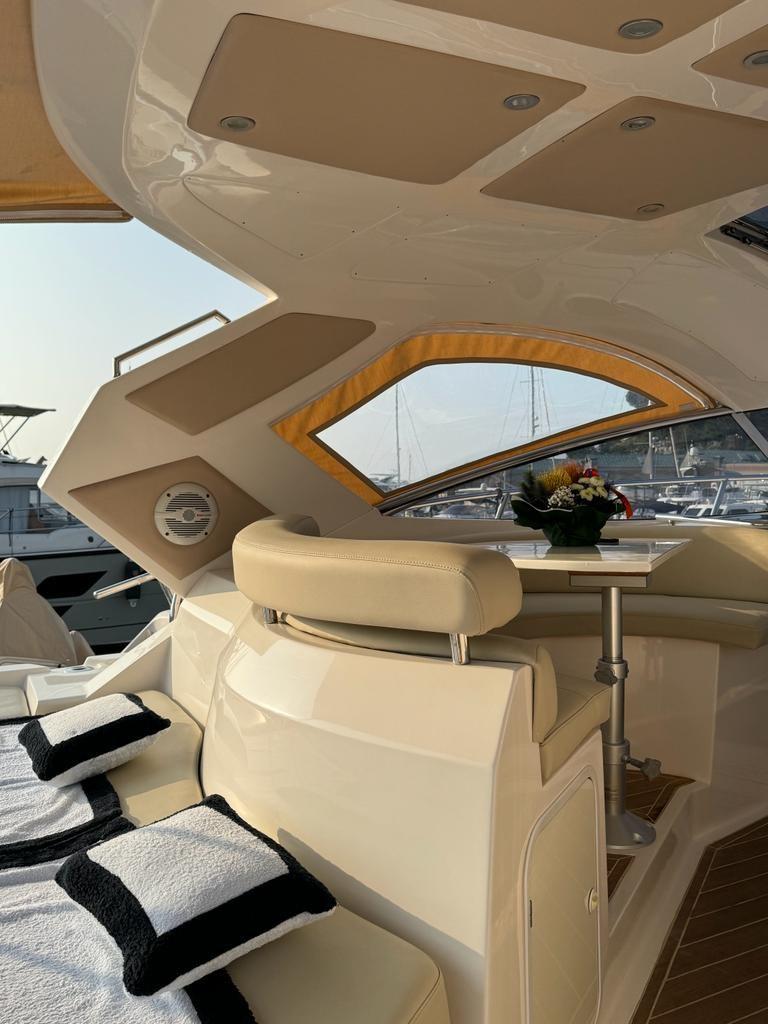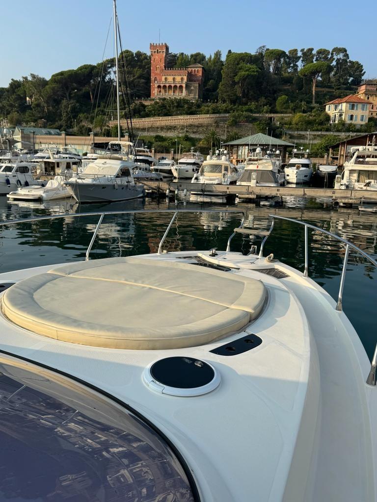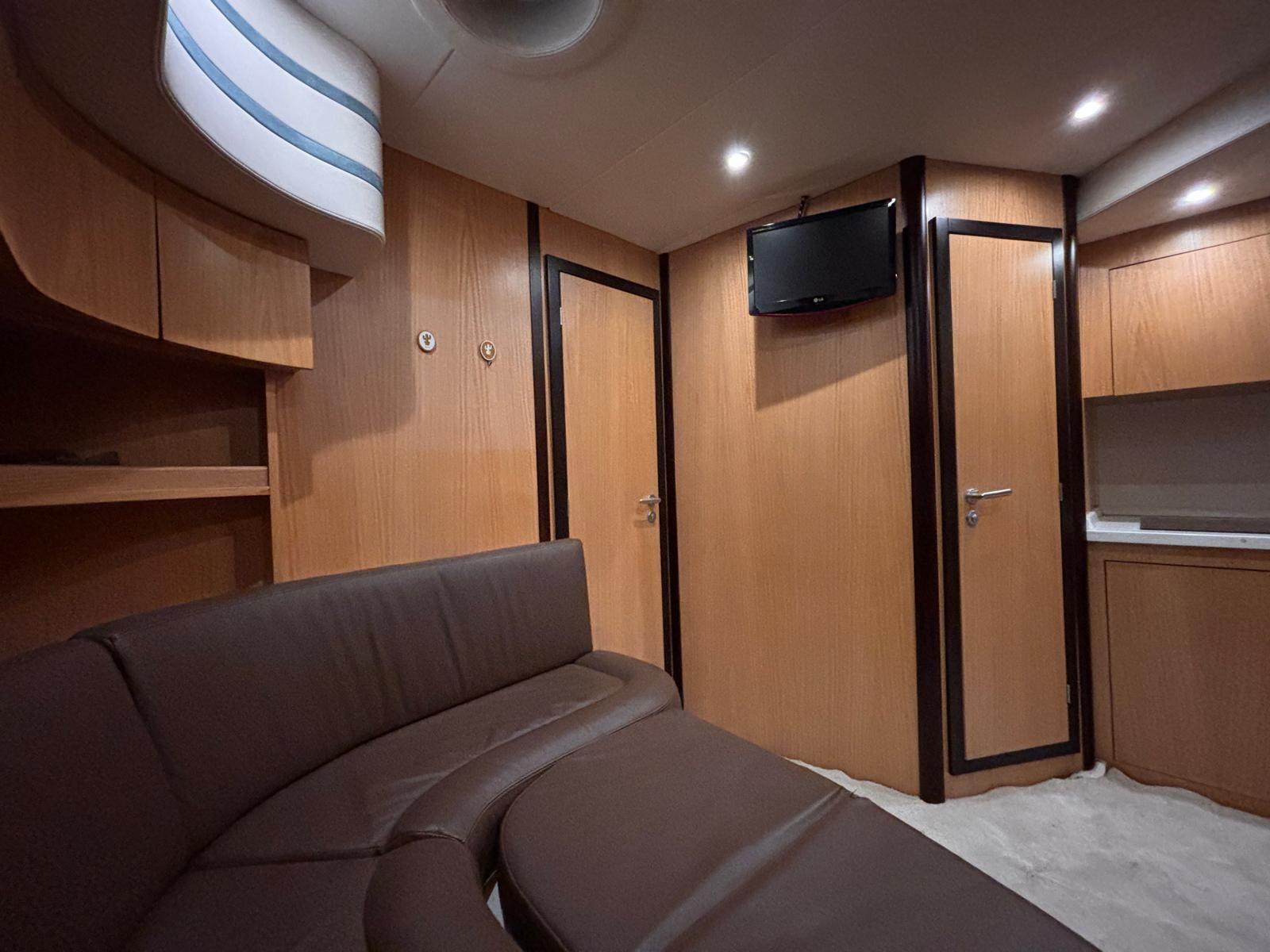 Accessories: Compass, chain counter, display, depth sounder, autopilot, plotter, VHF radio, anchor and chain, batteries, battery charger, bow thruster, electric flaps, gangway, electric bilge pump, 220v socket, electric windlass, swimming ladder, air conditioning, stereo and speakers, internal kitchen, stove, internal refrigerator