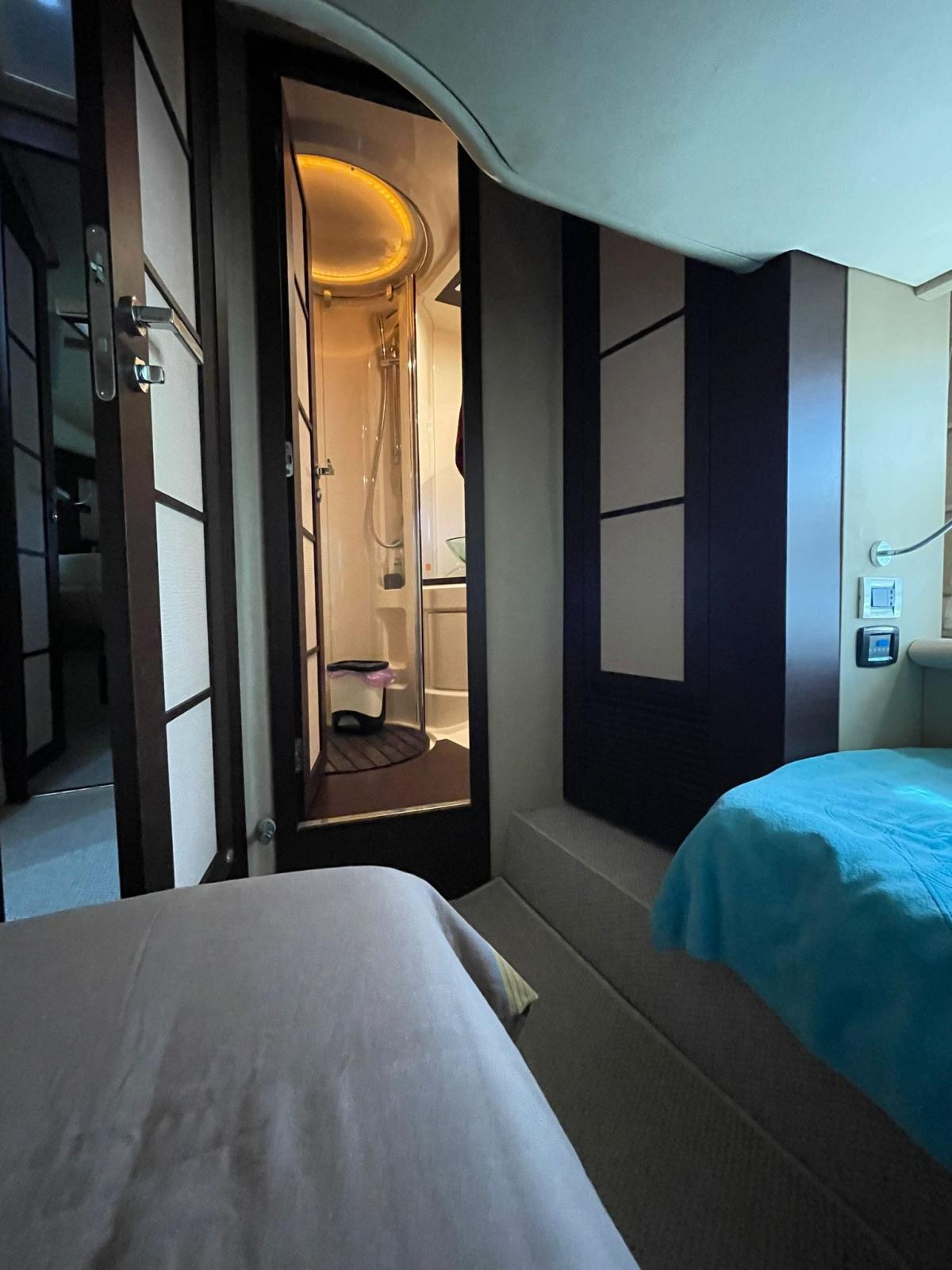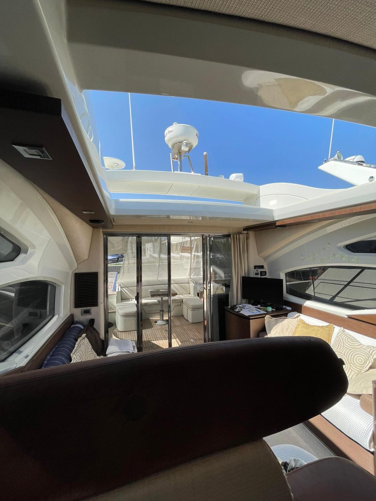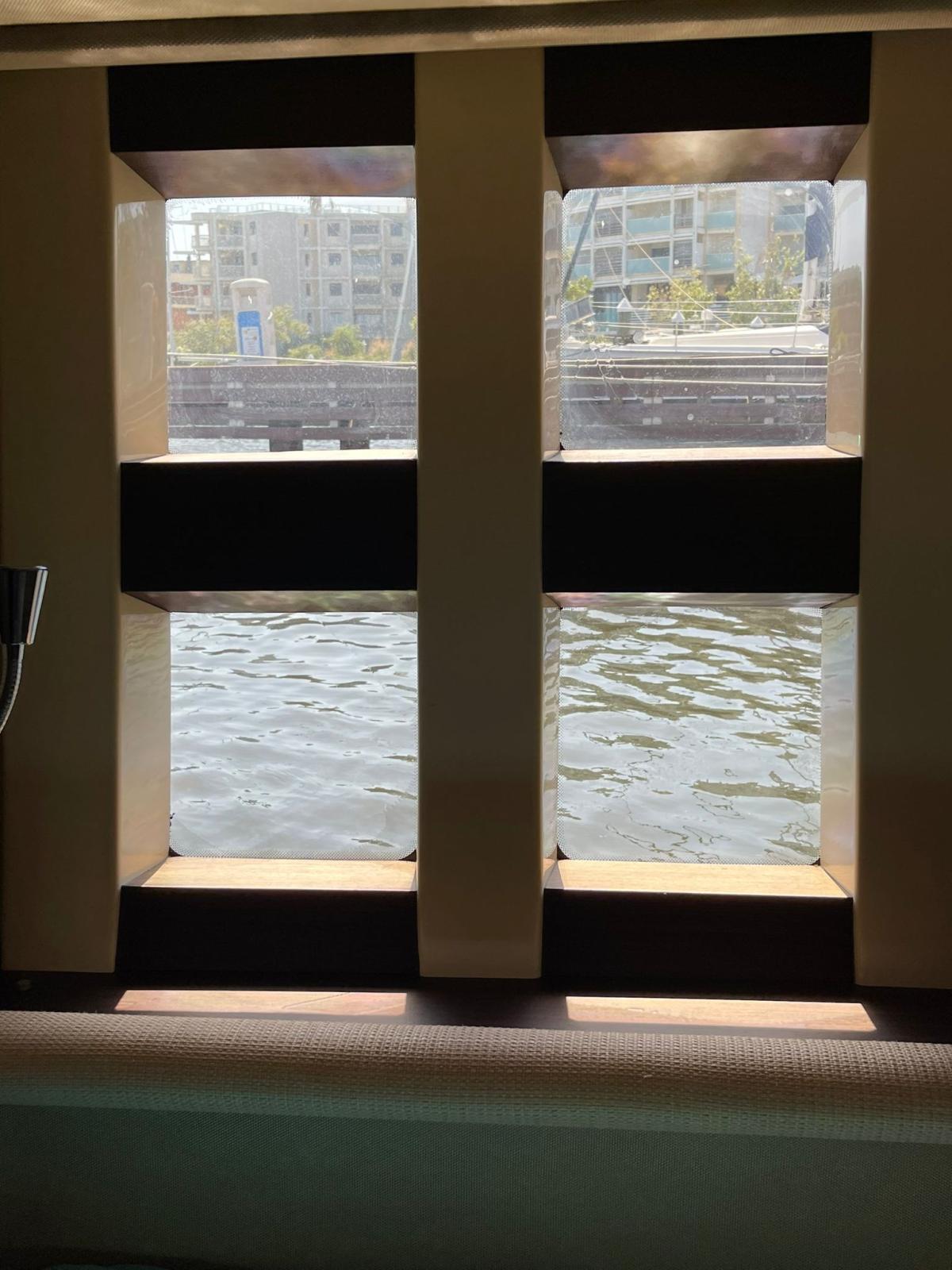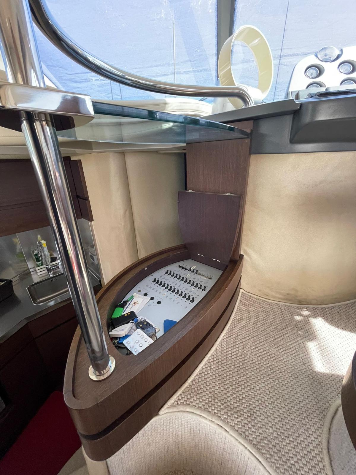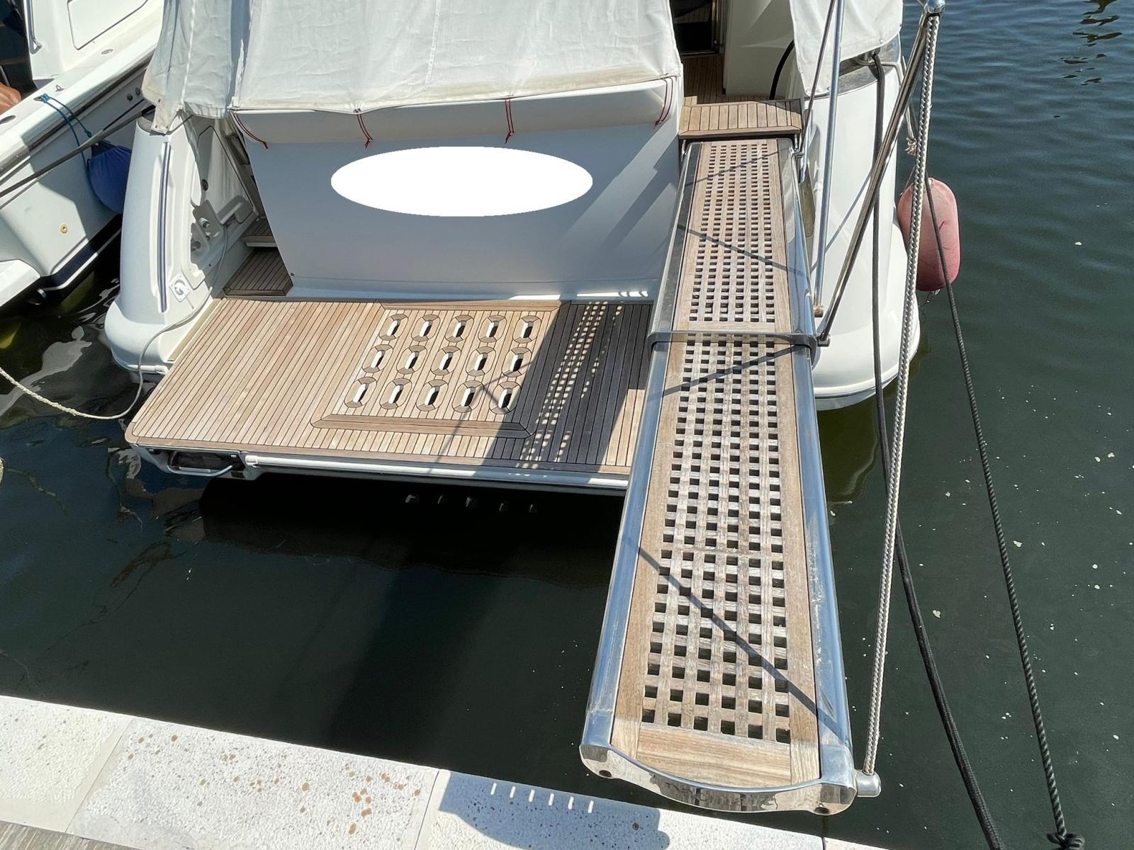Engine Alarm, Bilge Alarm, Alternator, Electric Engine Compartment Opening, Deck Suction of Dirty Water, Water pressure pump, Deck Shower, Directional Spotlight, Hydraulic Flaps, Hard top, Fire Extinguishing System, Flaps Indicators, Anchor Chain Washdown, Washbasin in the cockpit, Courtesy Lights, Underwater lights, Fenders, Gangway (IDRAULICA), Platform, Automatic Bilge Pump, Teak Cockpit, Shorepower connector, Water harbor connector system, Rollbar, Electric Windlass, swimming ladder, Saddles for tender, Waste Water Purifier System, cockpit table, Living Room Foldable Table.