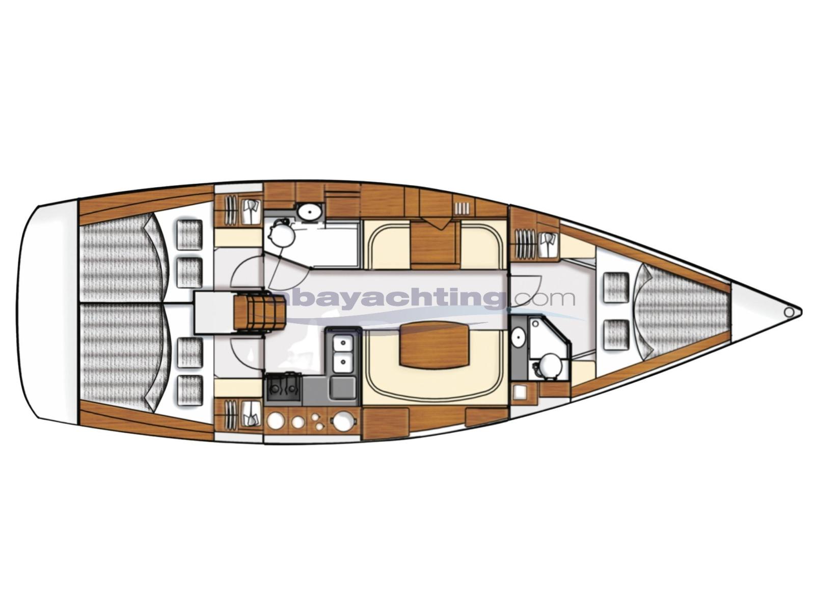 Moody 41 in After Cockpit version (aft cockpit) with 3 cabins and 2 bathrooms layout.