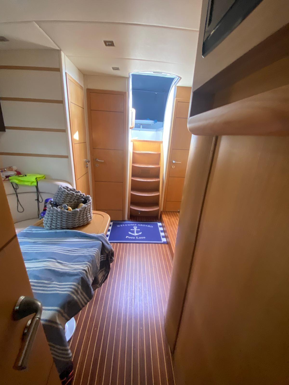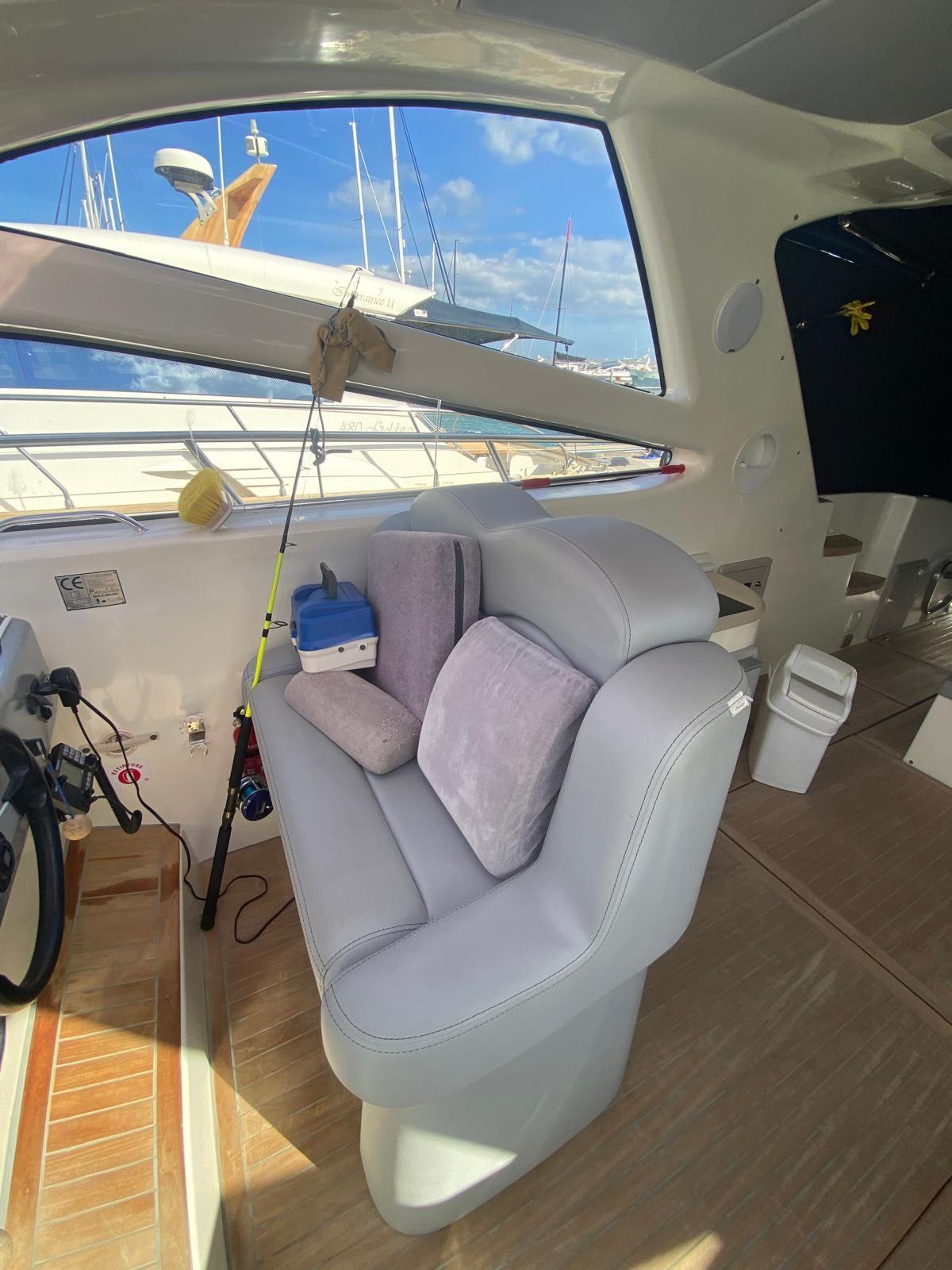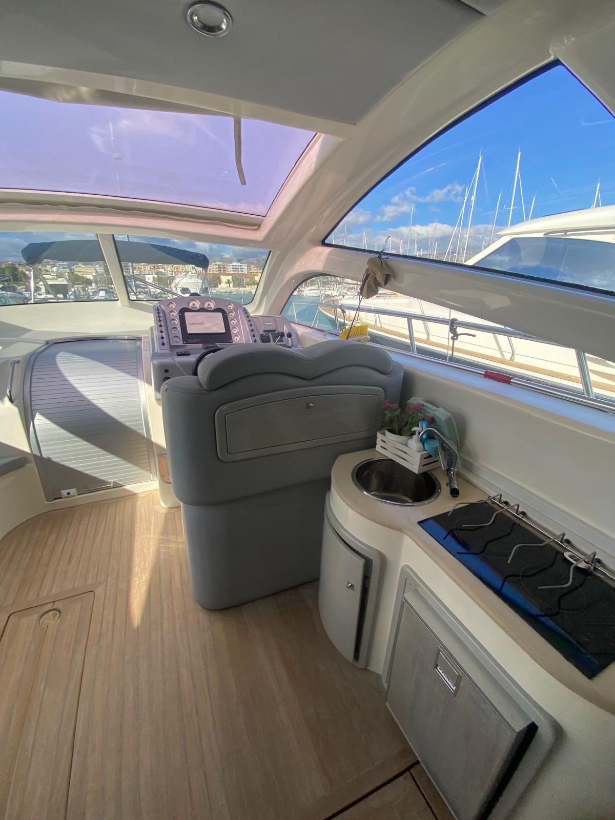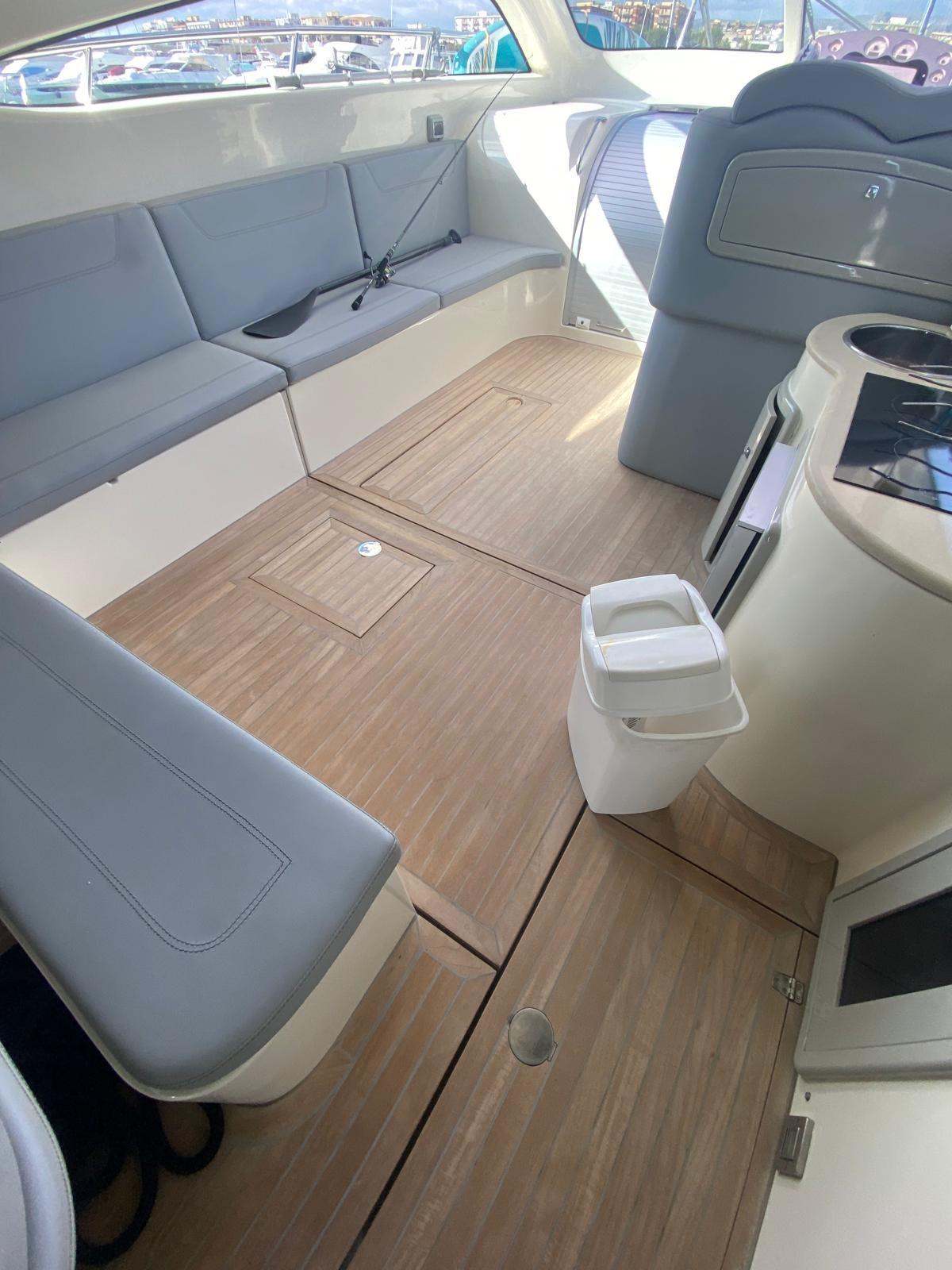 Engine Alarm, Bilge Alarm, Electric Engine Compartment Opening, Water pressure pump, Deck Shower, Directional Spotlight, Hydraulic Flaps, Hard top, Fire Extinguishing System, Flaps Indicators, Washbasin in the cockpit, Courtesy Lights, Underwater lights, Platform, Manual Bilge Pump, Teak Cockpit, Shorepower connector, Water harbor connector system, Electric Windlass, swimming ladder, cockpit table, Living Room Foldable Table, Tender, Horn.