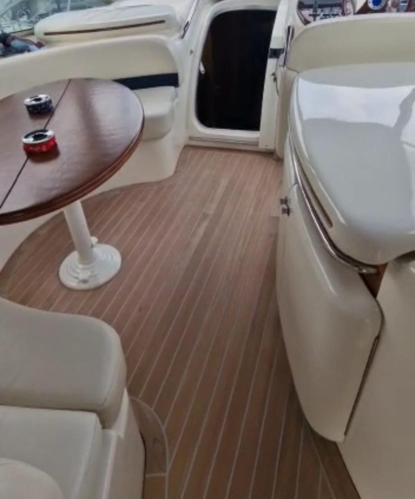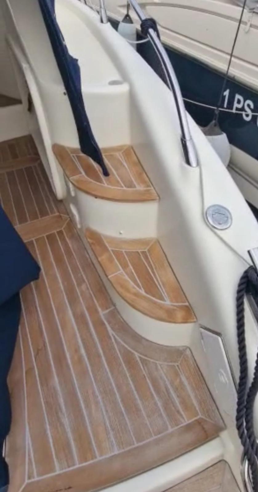 Engine Alarm, Electric Engine Compartment Opening, Water pressure pump, Deck Shower (calda e fredda), Directional Spotlight, Hydraulic Flaps, Washbasin in the cockpit, Courtesy Lights, Platform, Automatic Bilge Pump, Teak Cockpit, Shorepower connector, Water harbor connector system, Voltage Rectifier, Electric Windlass, swimming ladder, cockpit table.