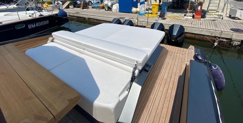 Awning for foredeck sunbathing area with n. 4 removable carbon poles Awning for aft sunbathing and dining area with n. 2 removable carbon poles Waterproof cover for conseole, seating and sunbeds