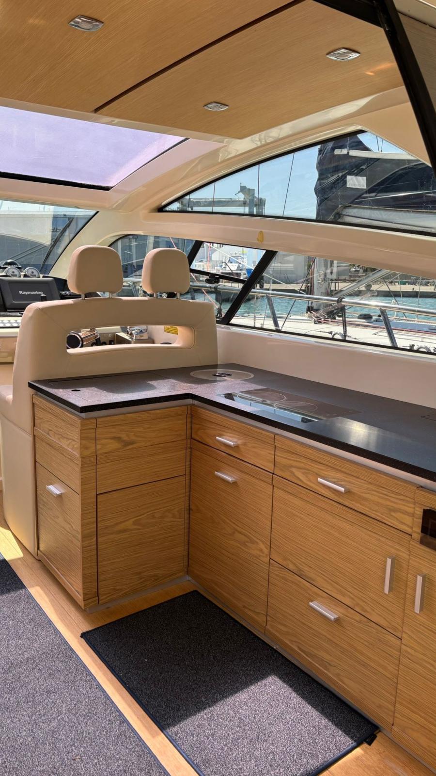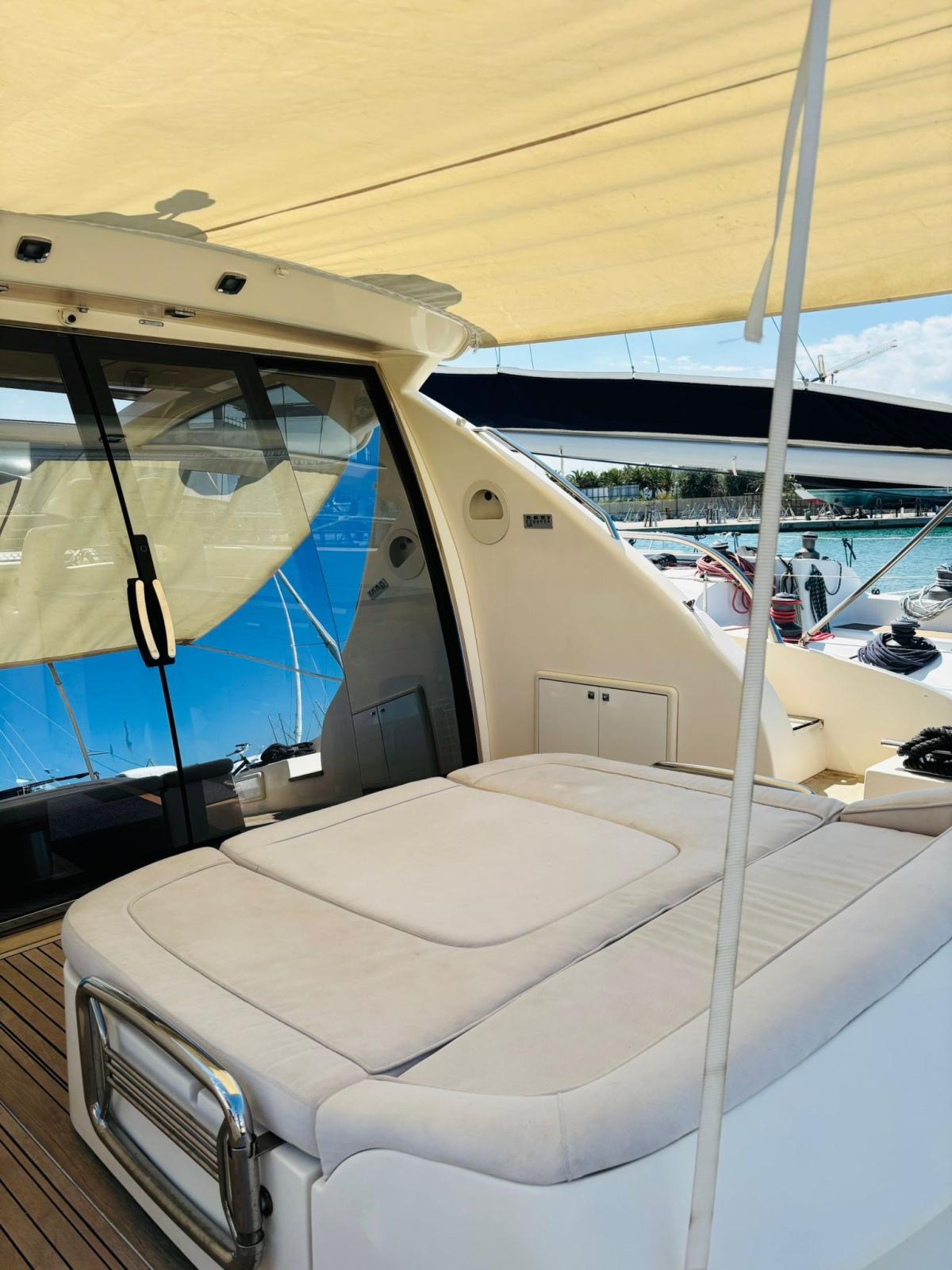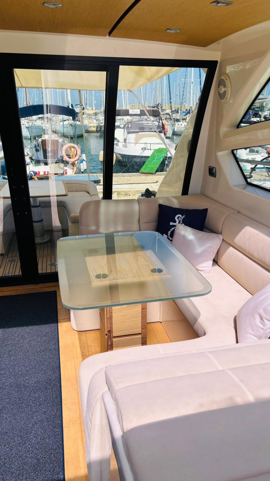 Engine Alarm, Bilge Alarm, Alternator, Water pressure pump, Teak Side Decks, Shore power cable, Deck Shower, Directional Spotlight, Hydraulic Flaps (BENNET - CON INDICATORE DI POSIZIONE), Tender Garage (Con apertura elettrica), Hard top, Underwater lights, 2 Solar panels (Montati sull’hard top), Gangway, Automatic Bilge Pump, Entry door, Teak Cockpit, Shorepower connector, Electric Windlass, cockpit table, Tender (Con fuoribordo Johnson 2,5).
