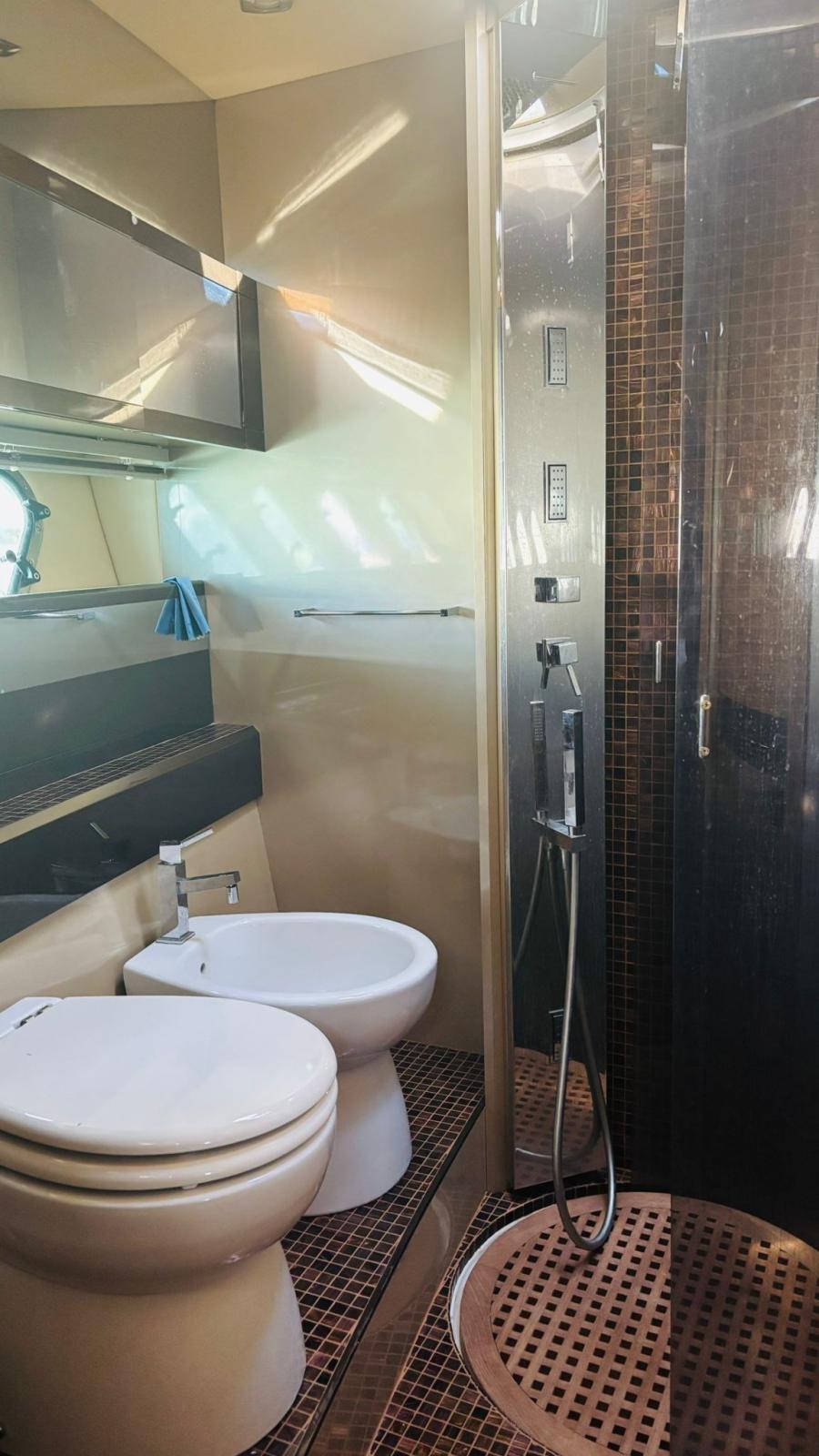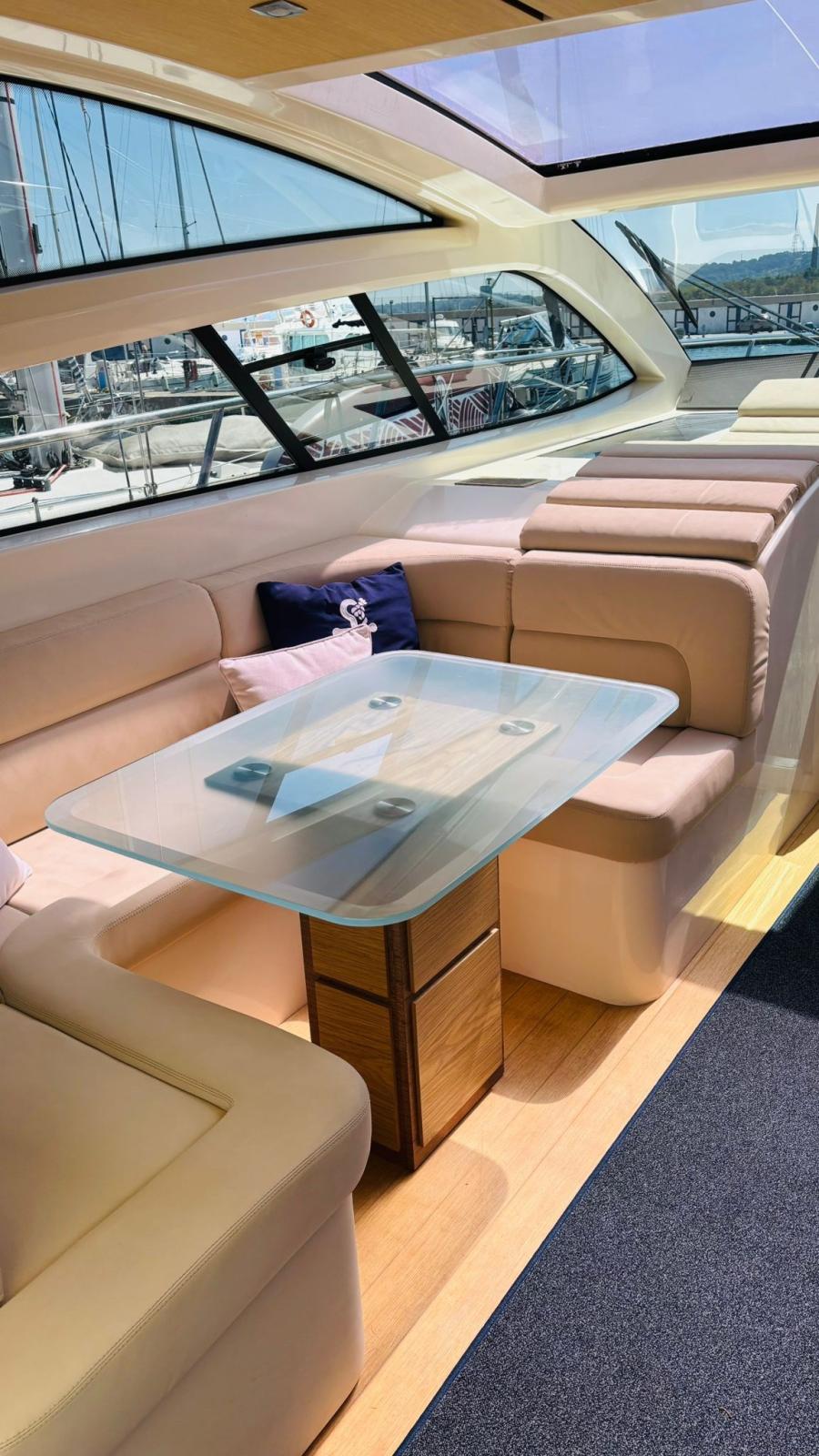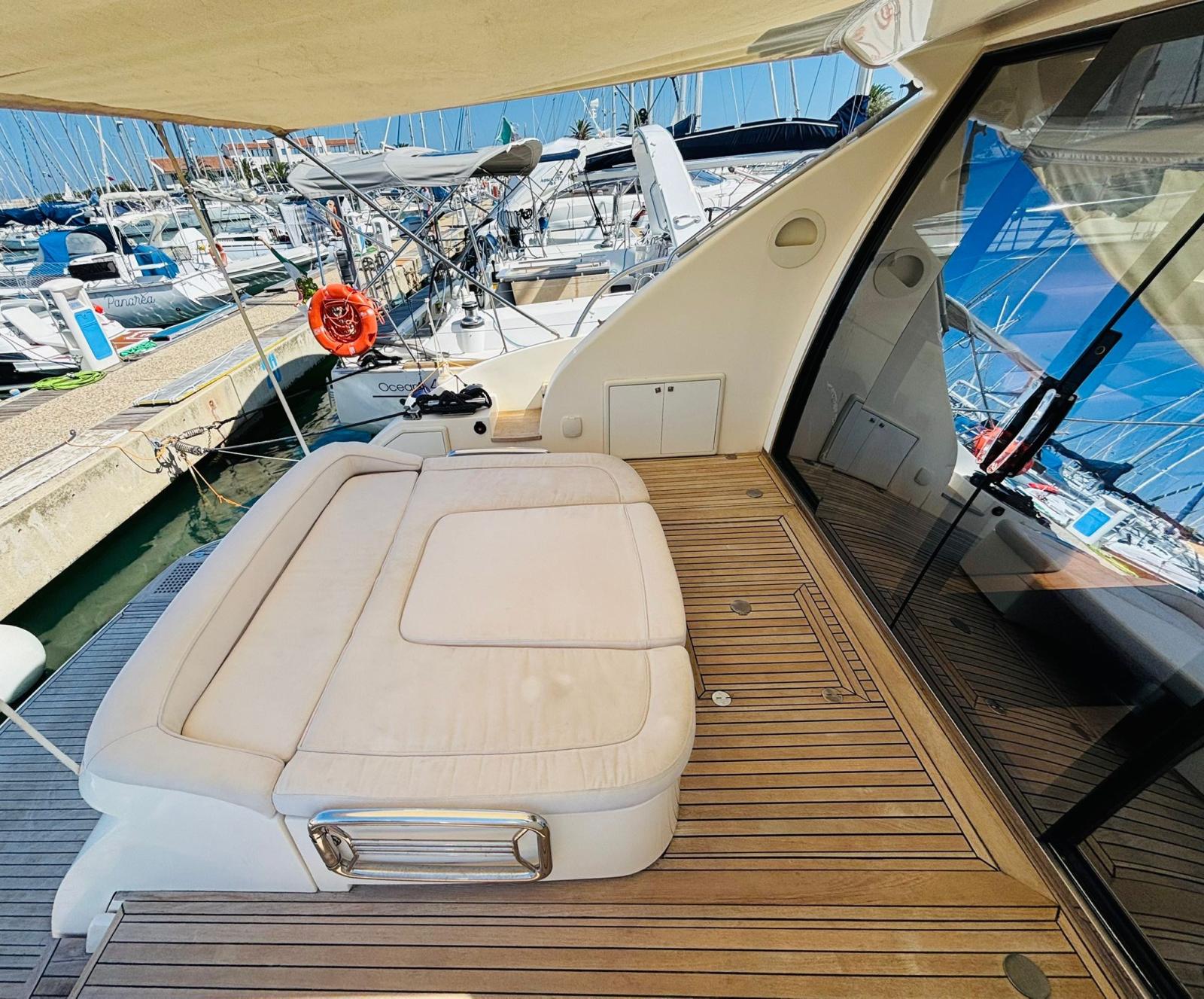 Engine Alarm, Bilge Alarm, Alternator, Water pressure pump, Teak Side Decks, Shore power cable, Deck Shower, Directional Spotlight, Hydraulic Flaps (BENNET - CON INDICATORE DI POSIZIONE), Tender Garage (Con apertura elettrica), Hard top, Underwater lights, 2 Solar panels (Montati sull’hard top), Gangway, Automatic Bilge Pump, Entry door, Teak Cockpit, Shorepower connector, Electric Windlass, cockpit table, Tender (Con fuoribordo Johnson 2,5).