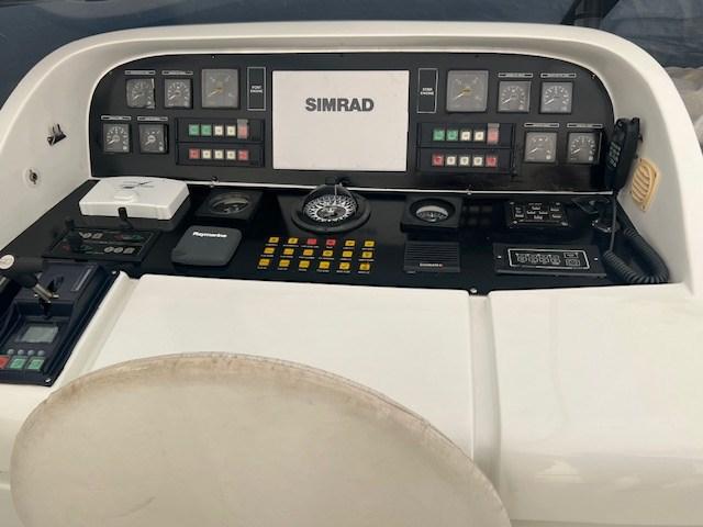 Rudder angle indicator, Electronic engine control, DSC vhf, Intercom, Autopilot (NAVCONTROL), Plotter with GPS antenna, Control panel, Radar (SIMRAD), Co-pilot seat.