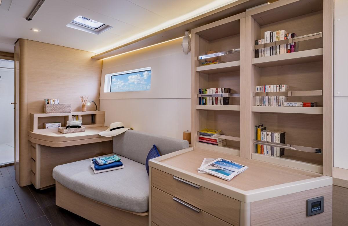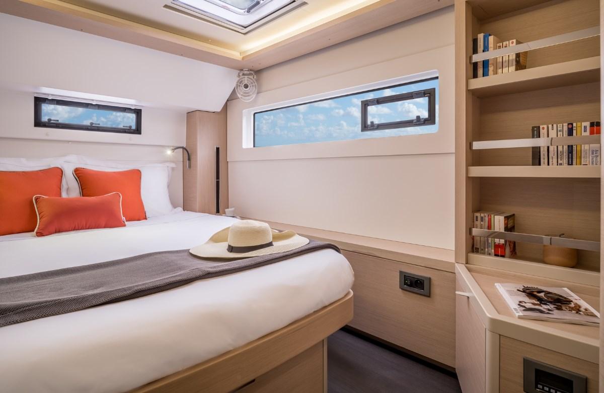 Designed by Nauta Design, the interiors of the Lagoon 46 are characterized by a refined, elegant and functional style. The private owner's spaces are generous, with an island bed offering maximum comfort. The other cabins of the catamaran are just as spacious, especially the bow cabin where the bed has nothing to envy compared to the aft solutions. To improve the quality of life on board, particular attention is paid to the finishes and interior brightness.