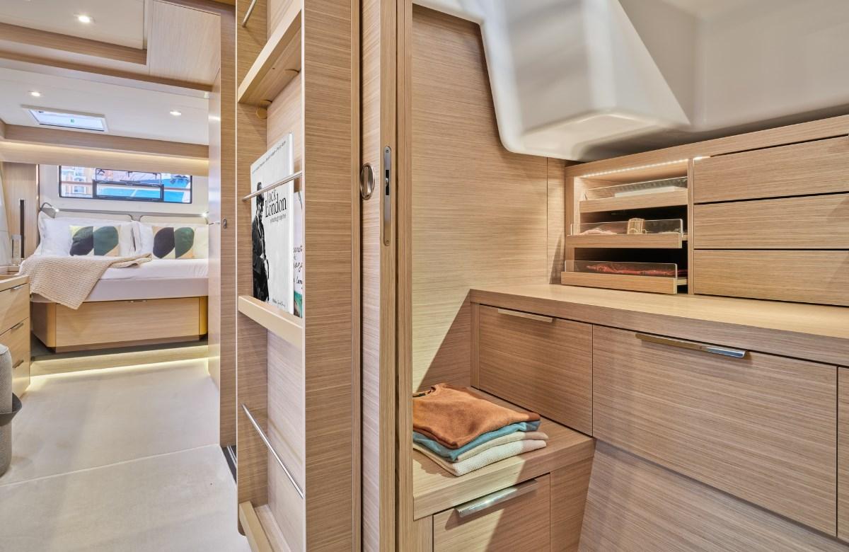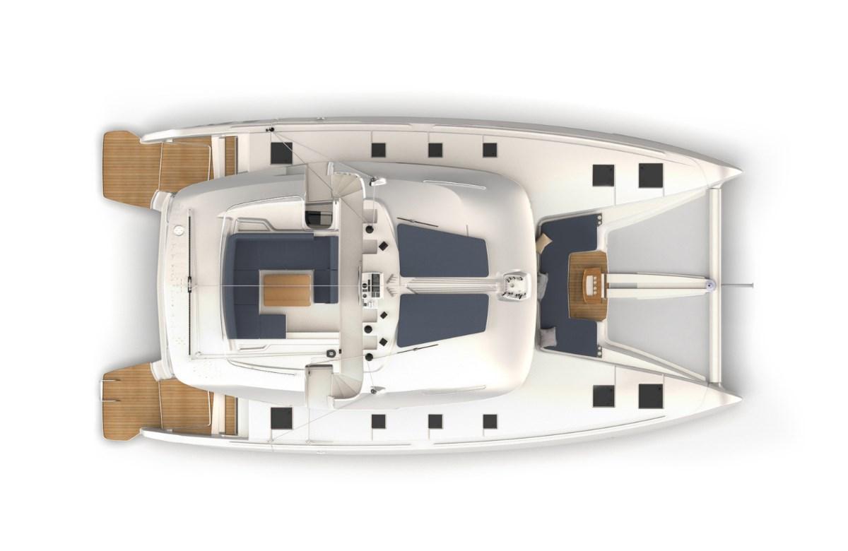 For the Lagoon 51, already equipped with walkable solar panels even in the standard version, it allows a further addition of XXL solar panels on the deckhouse. This technology provides over 3400 watts of power to run all onboard services. The new Lagoon 51 is therefore completely autonomous (except for air conditioning). The solar panels integrate perfectly into the lines of the catamaran and do not disturb life on board. The flybridge and sundecks on the deckhouse are accessible and usable both in the presence and absence of solar panels.