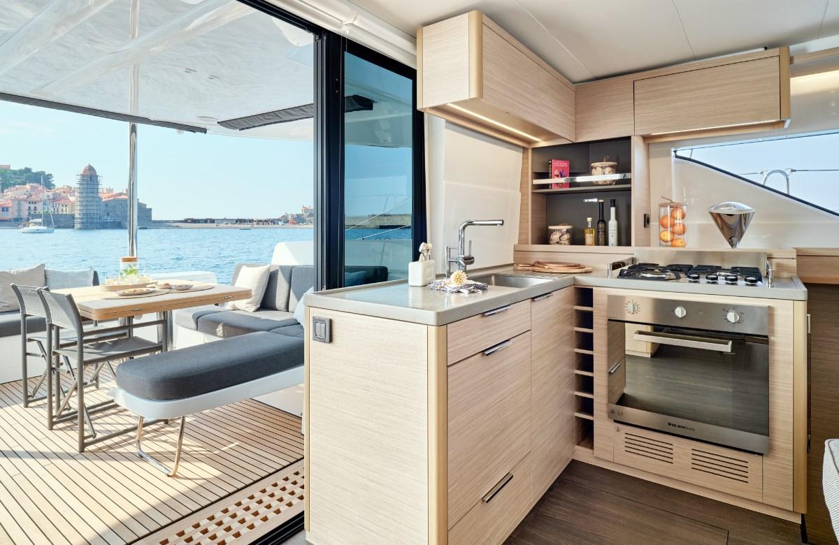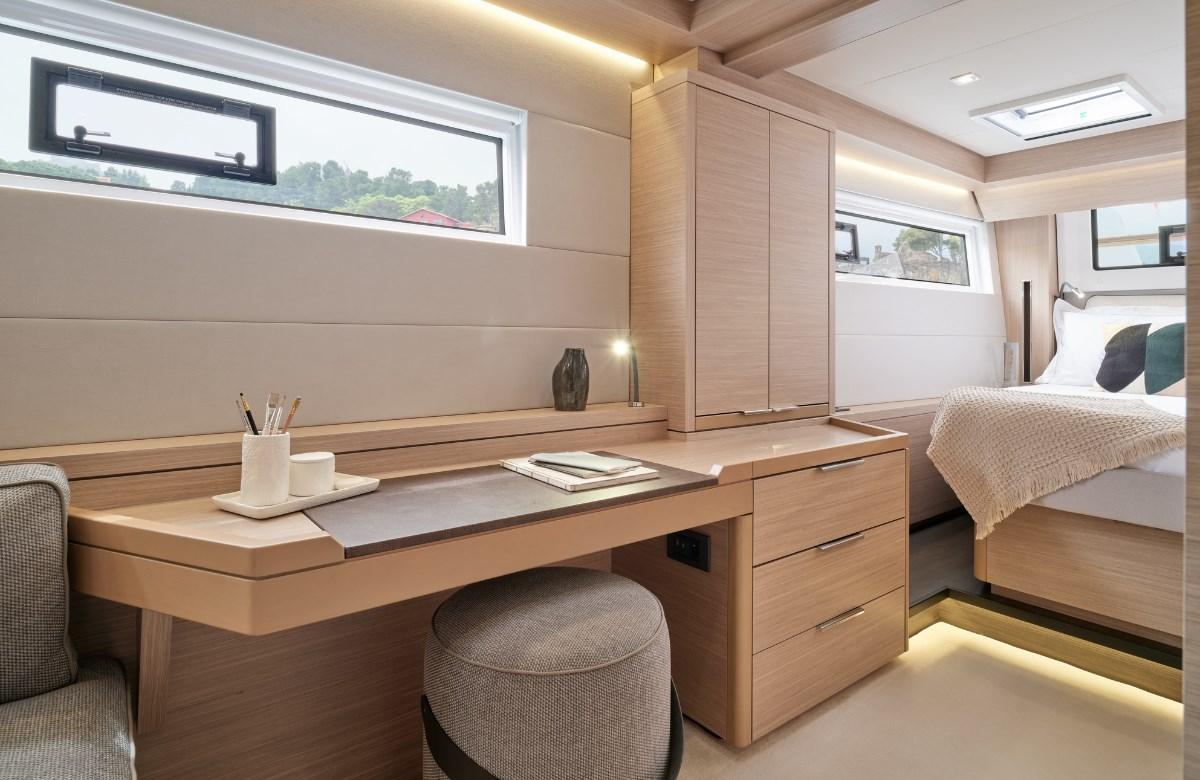 The first novelty of all are the optimised outdoor spaces: the flybridge of the Lagoon 51 is innovative for the modularity of its spaces, the ingenious ergonomics and the comfort of this large convivial space. The flybridge has been reformulated to occupy 80% of the deckhouse with 2 beautiful sundecks forward of the wheelhouse and a large area with C-shaped seating, in which the central table can be lowered to create an XL sundeck.