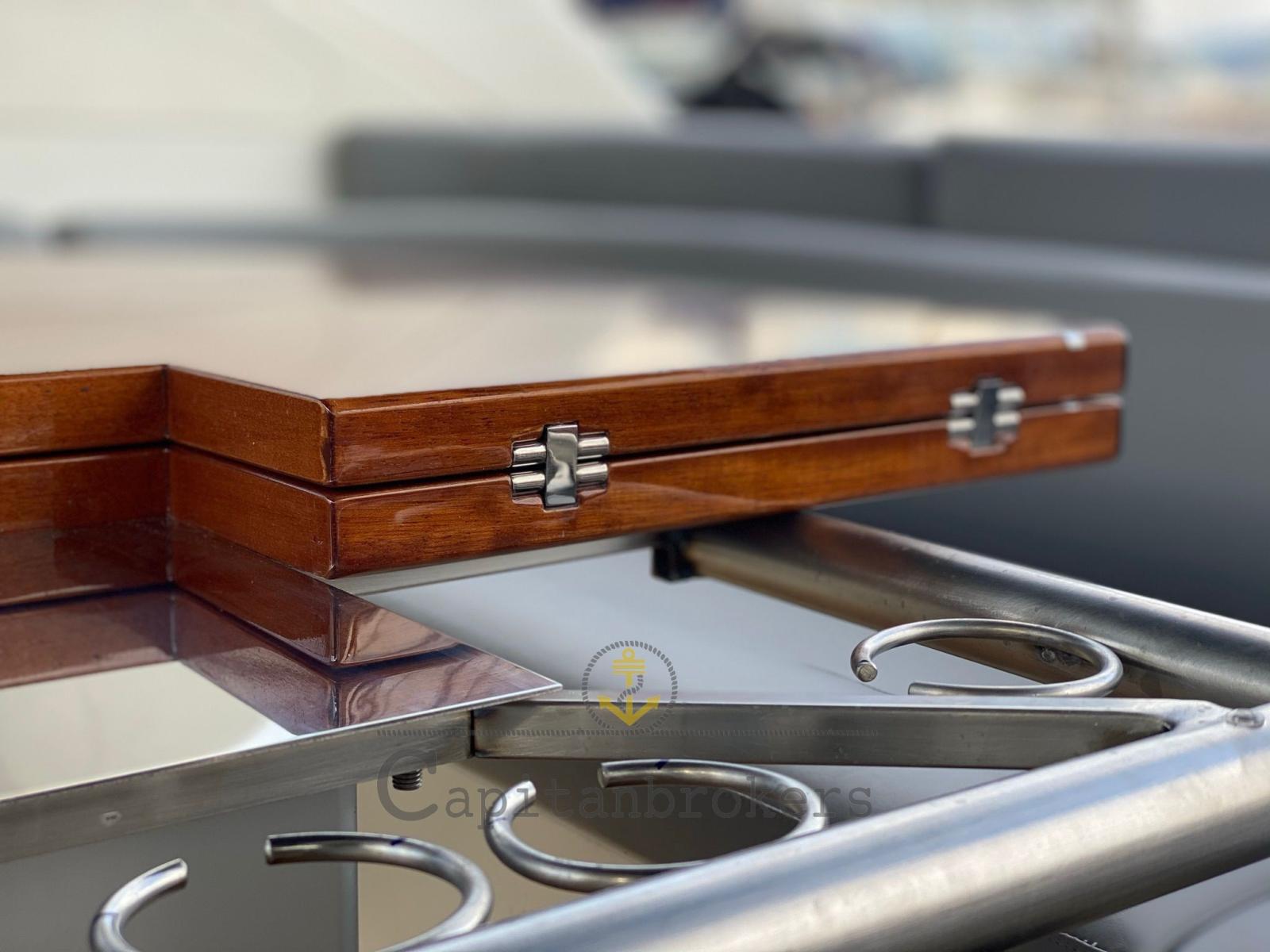 Engine Alarm, Bilge Alarm, Spare shaft, Water pressure pump, Batteries (nuove servizi e motori 2021), Special Colour, Deck Shower (calda-fredda), Bow Thruster (2014 installata), Secondary Propeller, Headlights fixed on the stem (underwater), Hydraulic Flaps, Fire Extinguishing System, Courtesy Lights (doppie nel pozzetto), Gangway (elettroidraulica), Platform (poppa in teak 2016 trattata 2021), Automatic Bilge Pump, Entry door, Teak Cockpit (2016 , trattato 2021), Shorepower connector, Electric Windlass, swimming ladder (allungata con maniglioni per facilitare la salita), cockpit table (totalmente nuovo in teak a scomparsa), Horn.