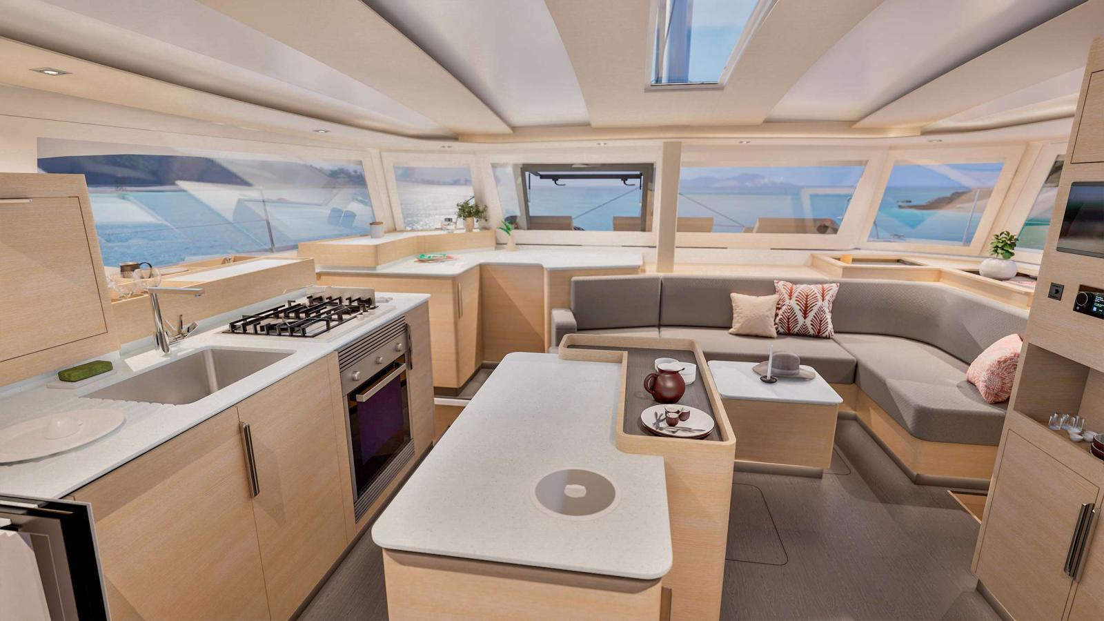 The spacious saloon accommodates an enlarged central island, a fully equipped galley with generous storage, and a large settee ideal for gathering the entire crew.