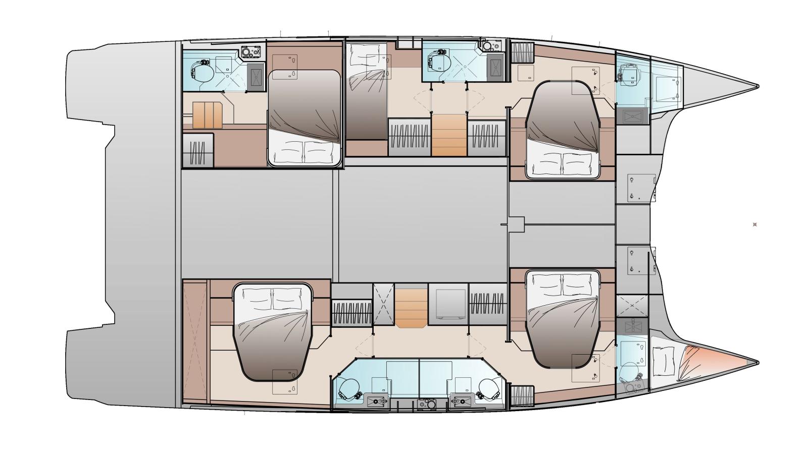 Designed for family cruising or charter programs, this version features four spacious double cabins facing the sea, plus an additional cabin with twin bunk beds — ideal for children or crew members.