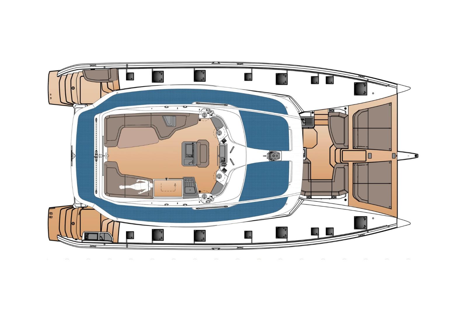 Her expansive flybridge, with a centralized helm station grouping all sail controls, provides outstanding visibility and a true 360° panoramic experience. Unique in her class, the FP | 55 can be configured with two identical owner’s suites, one in each hull, while still accommodating two fully equipped crew cabins.