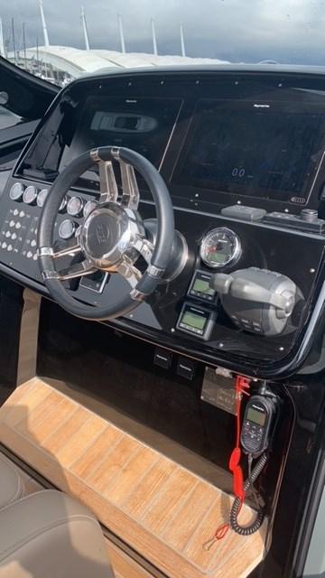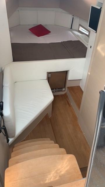 Side windows, aft shade awning with carbon poles, sunbathing cushions with chaise longue at the bow