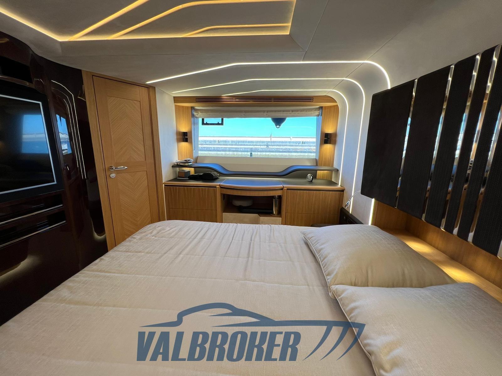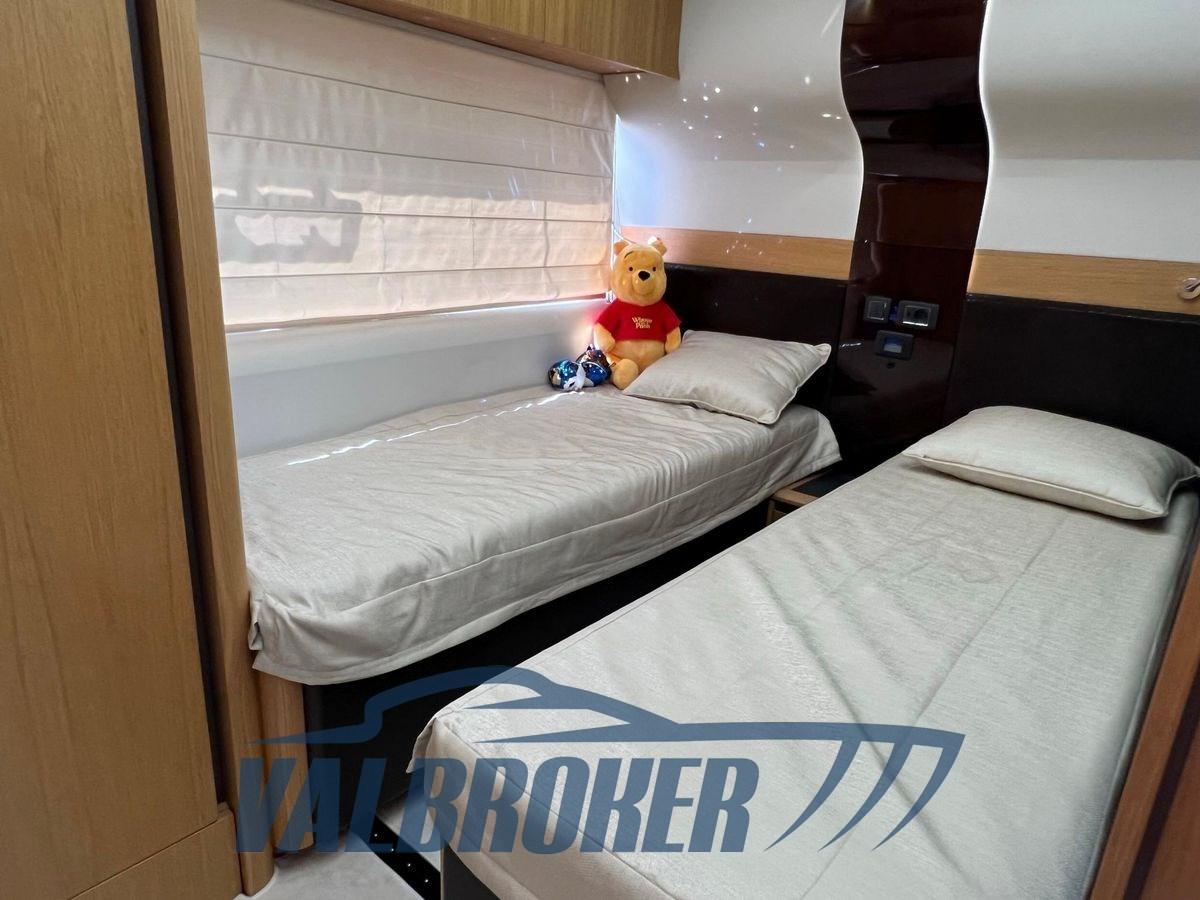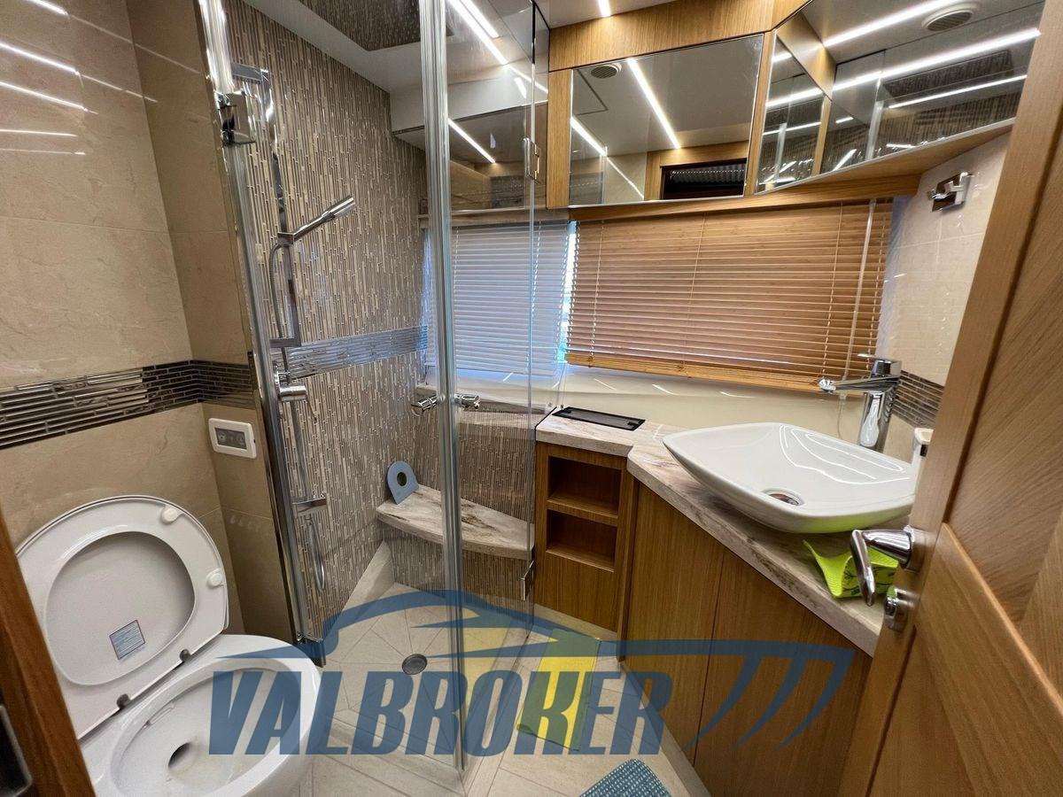 A full-beam master cabin with its own en-suite bathroom has a separate entrance from the saloon. The VIP cabin is located in the bow and two equipped double cabins, the other with an en-suite bathroom. The hardtop is equipped with an electrically operated soft top to allow for sun/shade.