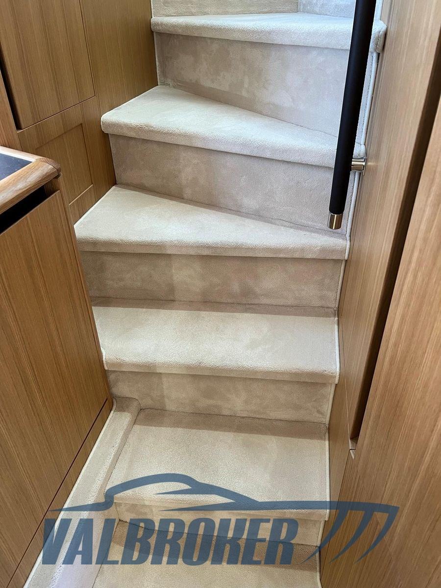 Electric Engine Compartment Opening, Auto Dynamic Trim Interceptor (Humphree), Water pressure pump, Teak Side Decks, Deck Shower, Hard top, Gangway (idraulica), Platform (idraulica, teak 700 kg), Manual Bilge Pump, Teak Cockpit, Shorepower connector, Electronic instrumentation repeater, Electric Windlass, swimming ladder, cockpit table (vetroresina).