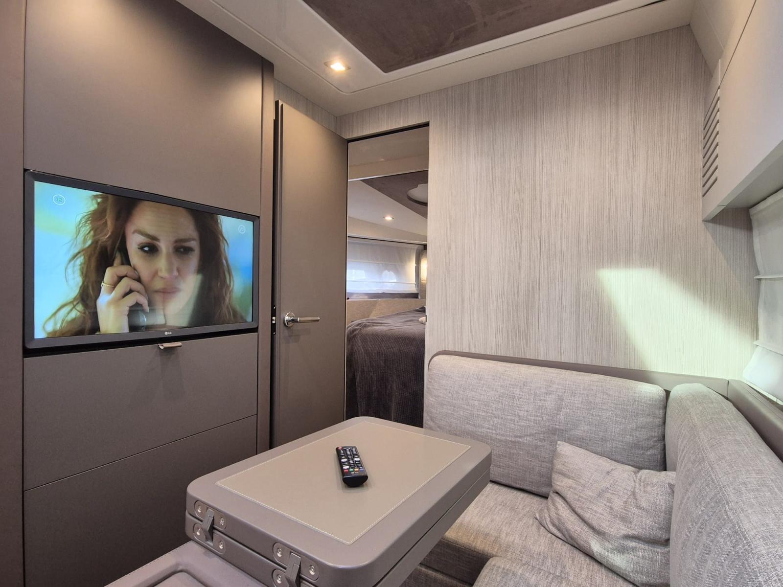 Engine Alarm, Bilge Alarm, Anchor (21 kg, Ultramarine), Batteries (engine and service), Deck Shower, Bow Thruster (with automatic fire extinguisher), Electric Flaps, Tender Garage, Hard top (fiberglass, with large opening electric roof), Fire Extinguishing System, Courtesy Lights, 3 Underwater lights, 6 Fenders (with fender covers), Gangway (hydraulic, 3 m, 3 steps), Platform, Teak Cockpit, Shorepower connector, Water harbor connector system, swimming ladder, cockpit table, Teak Deckhouse, Winch (anchor winch with remote control).