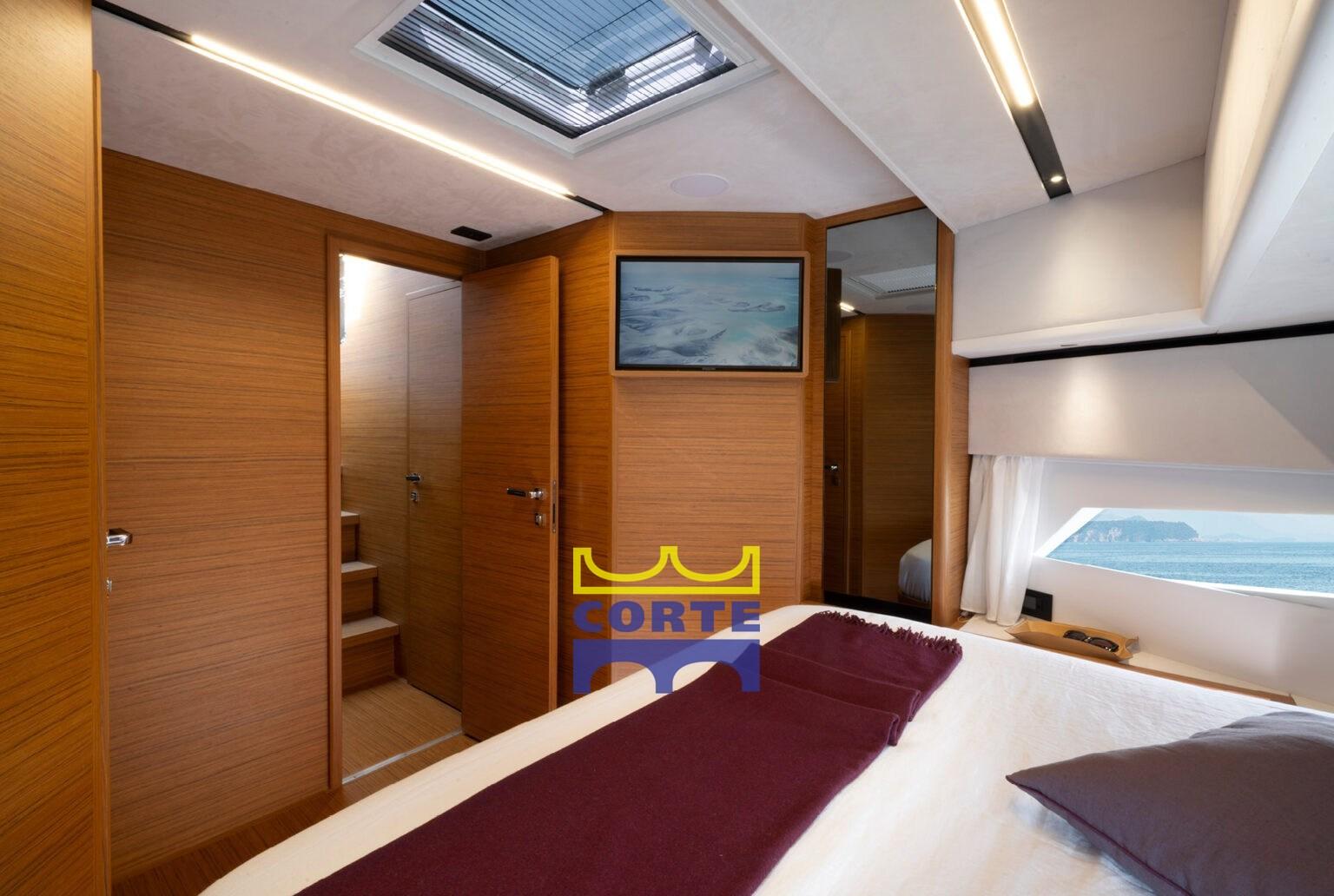 Natural teak deck with black comment, gangway control via app, tender launching system with rollers and electric winch, electric headlight, Garmin cartography
