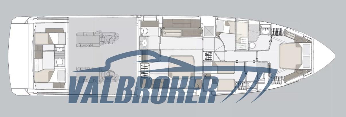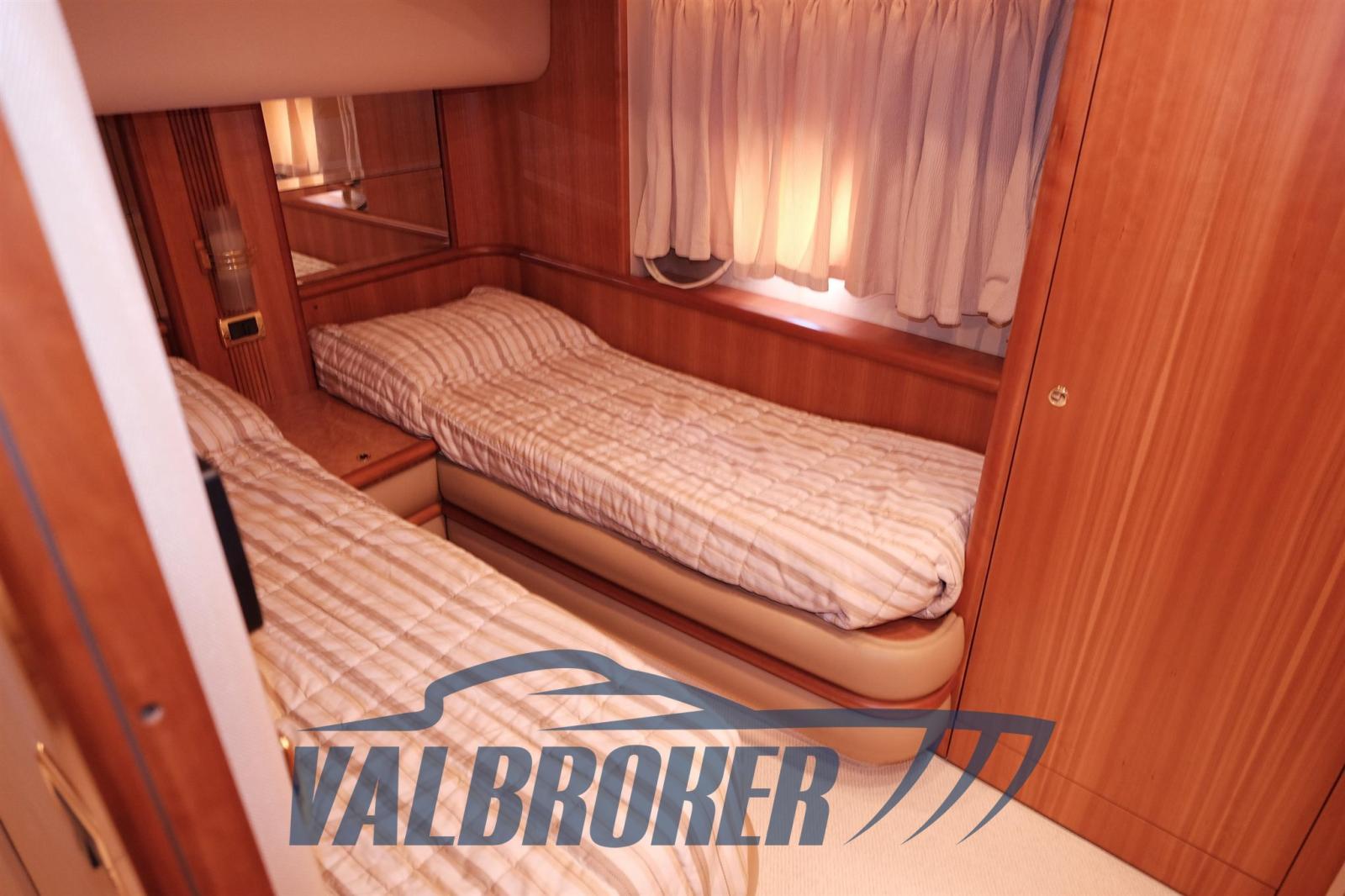 4 cabins, 4 bathrooms with shower cubicle and sailor cabin. Never used for charter. Powered by 2x1,360 Hp MAN, shaft line transmission. Every year the engines and generators are completely serviced. Important and constant maintenance work carried out between 2023 and 2025 is all documented with invoices. 2023: flaps pistons, overhaul of exchangers, new upholstery, new cushions, carpet, FUSION system and 8 speakers, overhaul of the air conditioning pump. 2024: Sub Woofer, RAYMARINE Autopilot Display ,VHF RAYMARINE RAY91. 2025: complete gelson polishing, complete teak treatment, Arimar raft overhaul, watermaker service, new boning display for flybridge, blackout overhaul (black and white mesh), new charger, new shore cable.