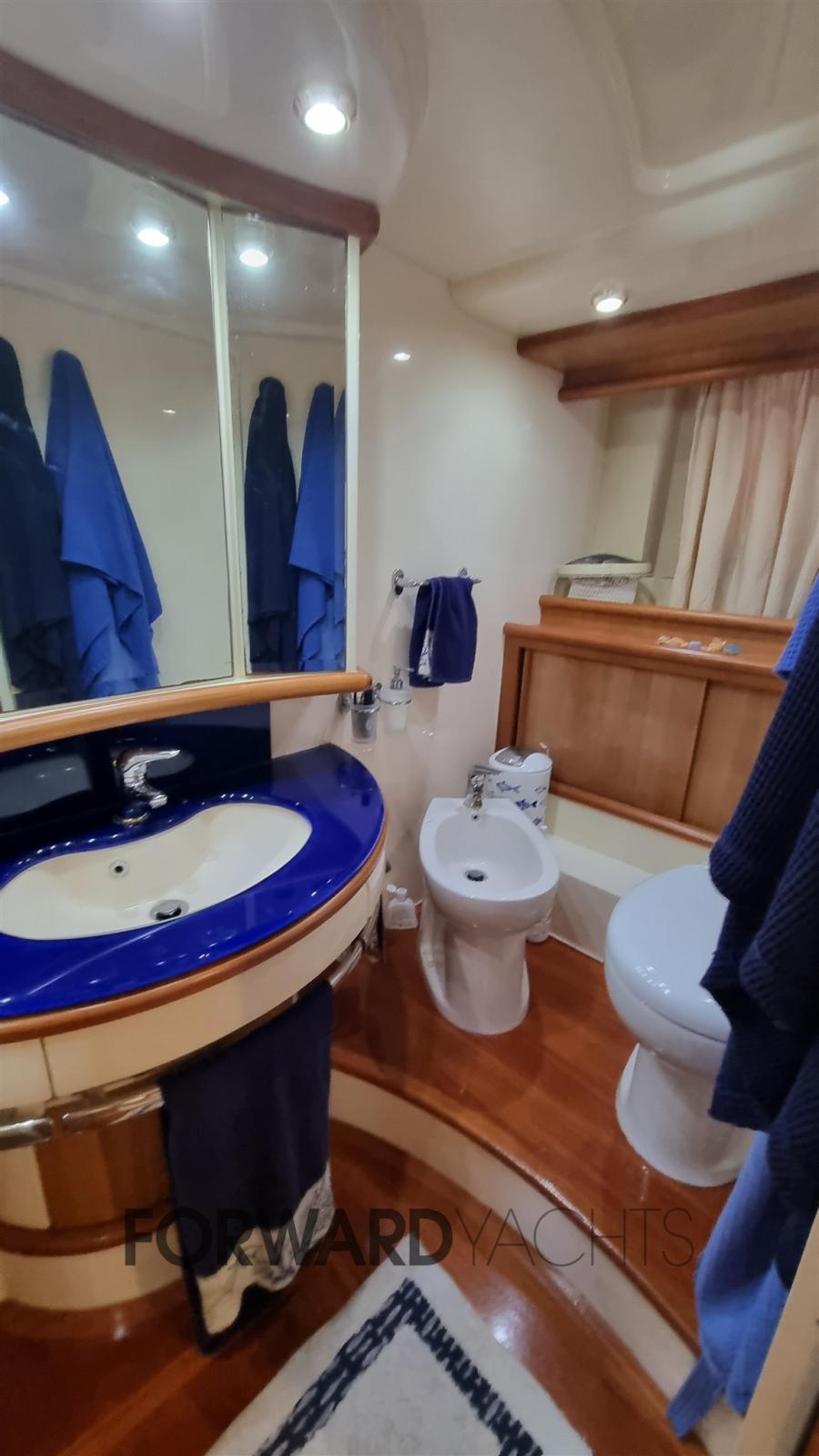Water pressure pump, Deck Shower, Twin Steering, Hydraulic Flaps, Davits for tender on fly, Fire Extinguishing System, Flaps Indicators, Courtesy Lights, Gangway (Idraulica), Platform (Teak), Automatic Bilge Pump, Side door, Teak Cockpit, Shorepower connector, Electric Windlass, swimming ladder, cockpit table, 2 Winch Electric, Stern Winches.