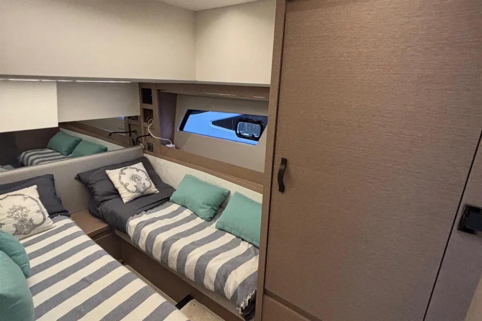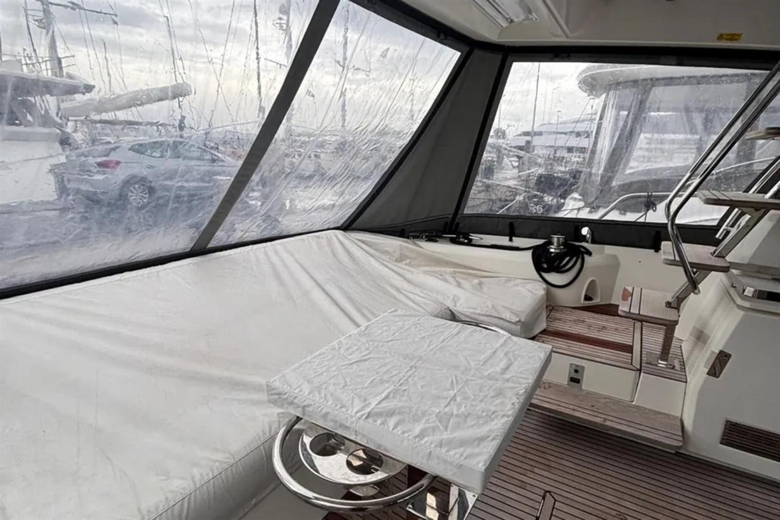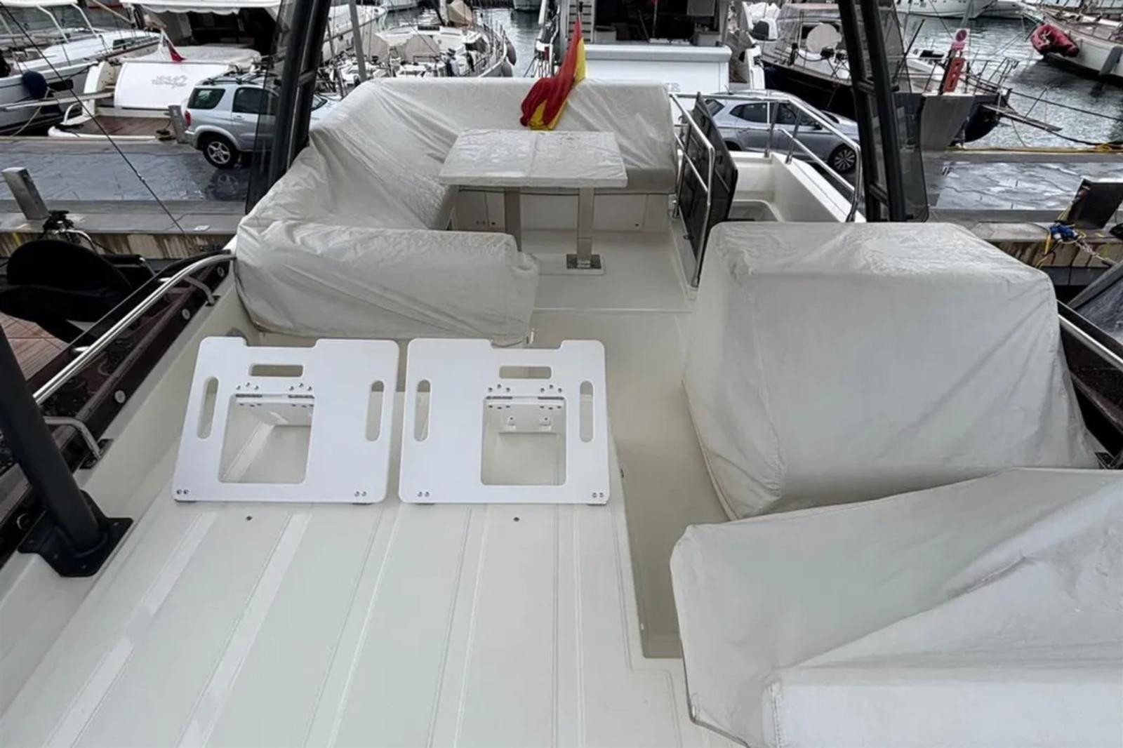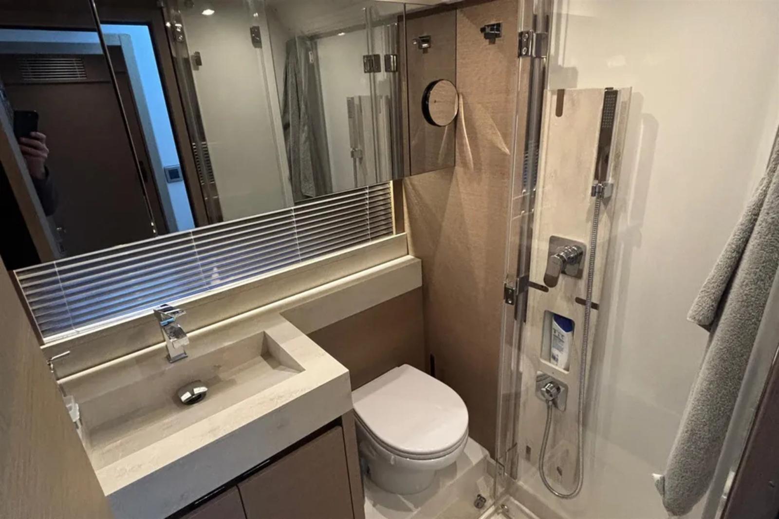 Engine Alarm, Bilge Alarm, Water pressure pump, 8 Batteries, Teak Side Decks, Deck Shower, Twin Steering, Directional Spotlight, Electric Flaps (ZIPWAKE), Tender Garage, Hard top (SUL FLYBRIDGE CON ILLUMINAZIONE LED), Fire Extinguishing System, Flaps Indicators, Underwater lights, Battery Monitor, Gangway (IDRAULICA), Platform (AFFONDANTE), 3 Automatic Bilge Pump, Entry door, Teak Cockpit, Shorepower connector, Water harbor connector system, Electric Windlass, swimming ladder, Stabilizers (SEAKEEPER NG6), cockpit table, guard rails with gates, Horn, Stern Winches, Bow Winches.