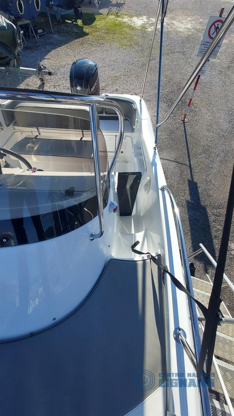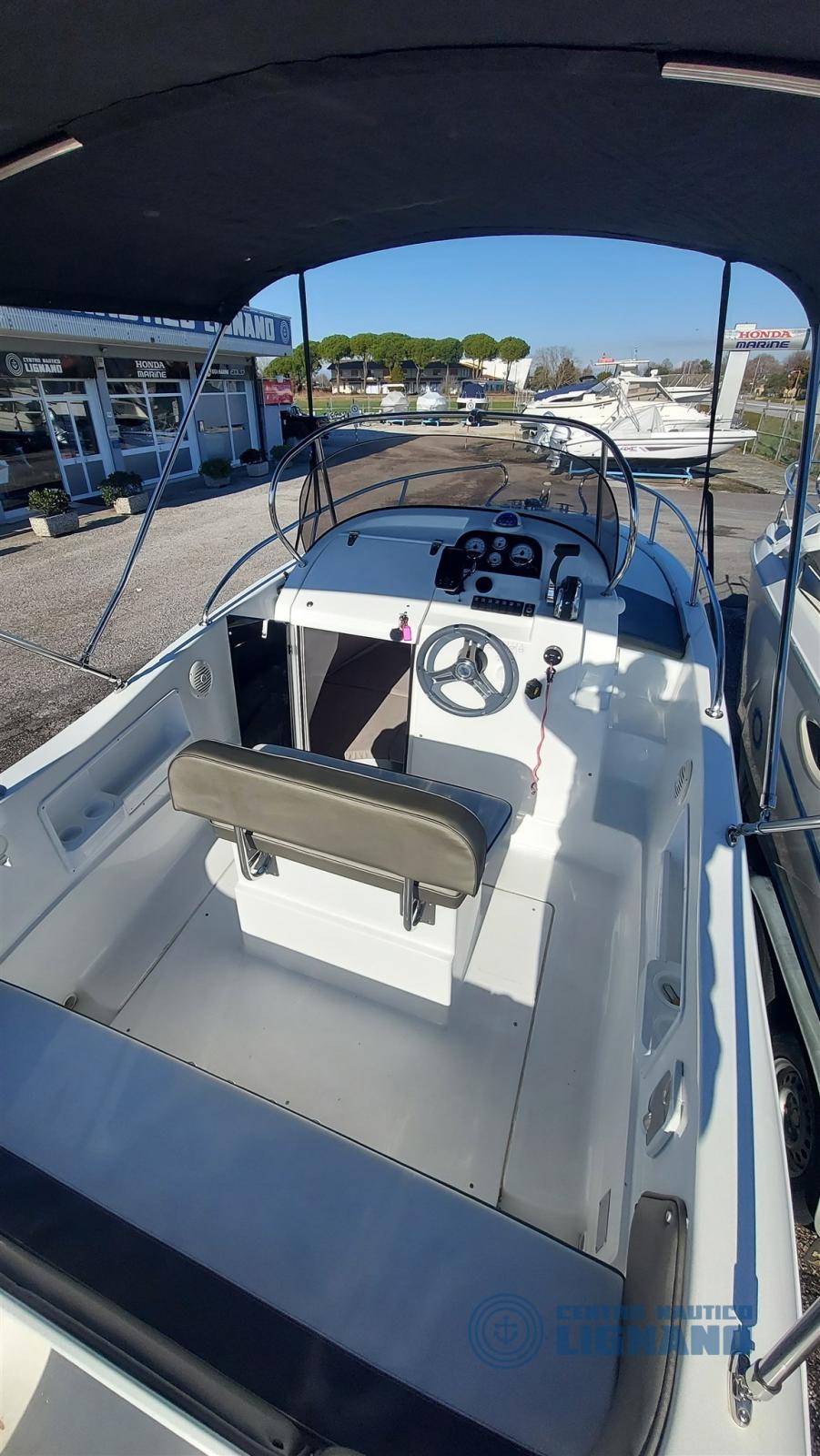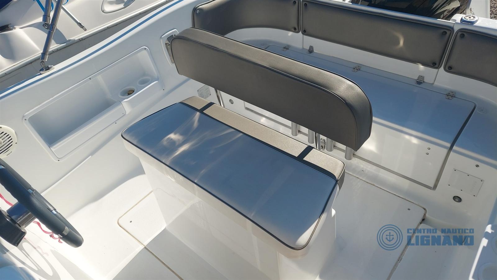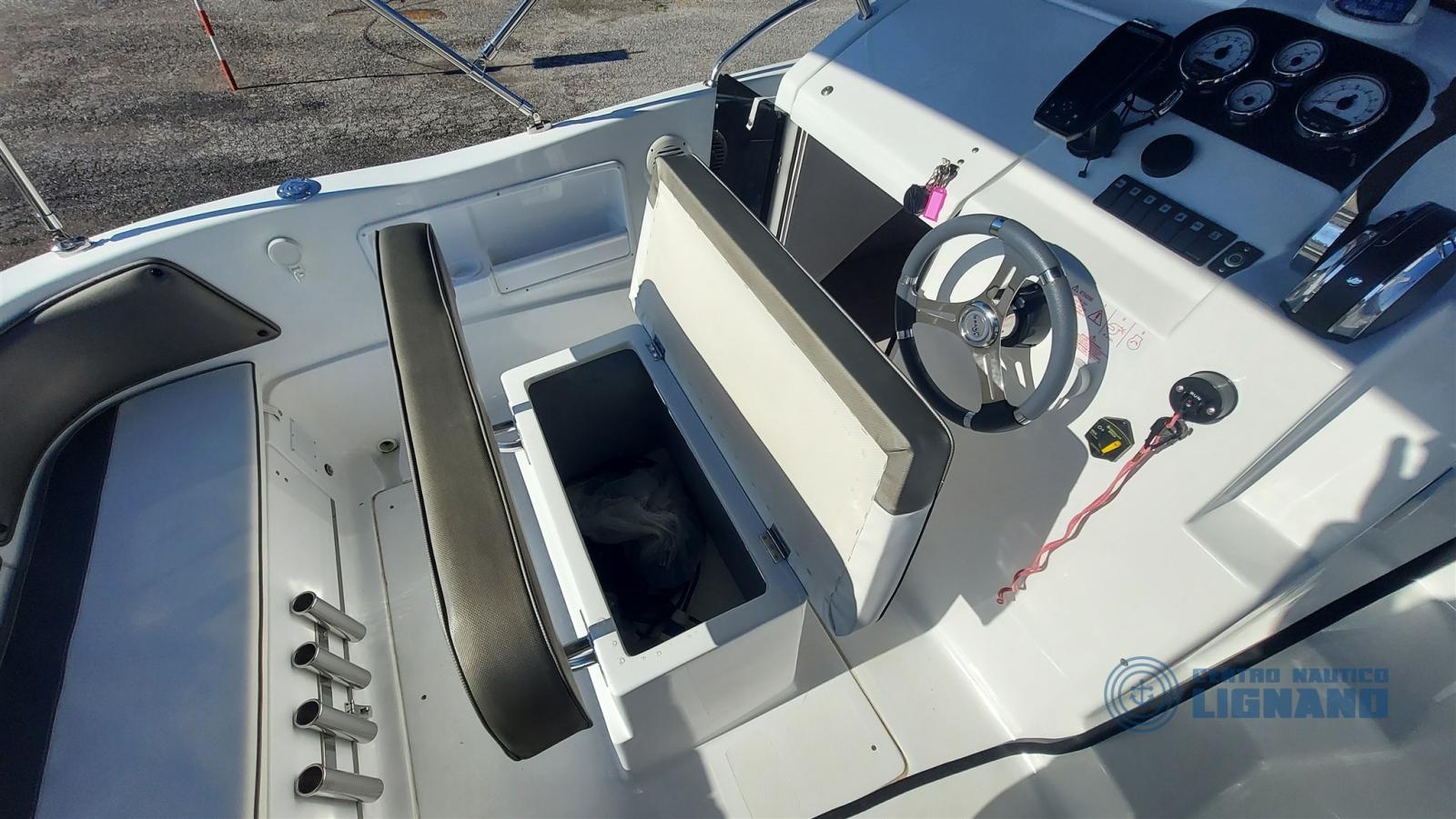 Cabin with 2 berths with perfect and fragrant complete internal cushions, porthole mosquito net, Garmin removable echo sounder transducer on bracket, no toilet, stereo system with 2 speakers, perfect external cushions like new, opening driver's seat with large locker, 12V double battery electrical system with watertight boxes, telescopic sea ladder, aft tank for the catch, steel rod holder (4), side pockets for objects, stern locker fan, water tank and shower, regulation navigation lights, self-supporting stainless steel awning with case (perfect), electric winch with anchor and chain and double control, console cover, total cover with zipper in the center, stainless steel side handrails. More visit to our Centro Nautico Lignano shipyard. Direct info 3474077005,
