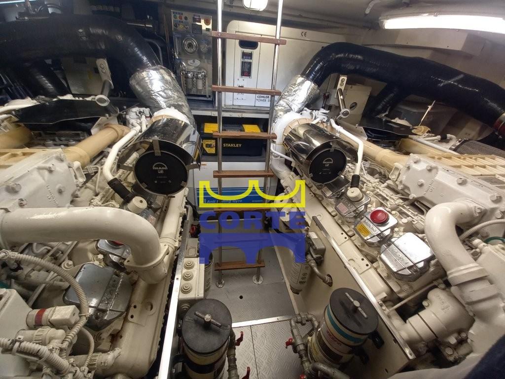 Fume/Gas Detector, Engine Alarm, Bilge Alarm, Anchor (Bruce e catena 75 m), Water pressure pump, Shore power cable, Deck Shower, Twin Steering, Hydraulic Flaps, Tender Crane (passerella), Fire Extinguishing System, Compressor Air System, Washbasin in the cockpit, Courtesy Lights, Underwater lights, Battery Monitor, 2 Gangway (elettroidraulica e passerella pieghevole con candelieri), Platform (di poppa), Automatic Bilge Pump, Manual Bilge Pump, Entry door, Side door, Teak Cockpit, Shorepower connector, Water harbor connector system, Electronic instrumentation repeater, Rollbar, Electric Windlass, swimming ladder, Stabilizers (Arg Mitsubishi), cockpit table, Horn, 2 Stern Winches, Bow Winches.