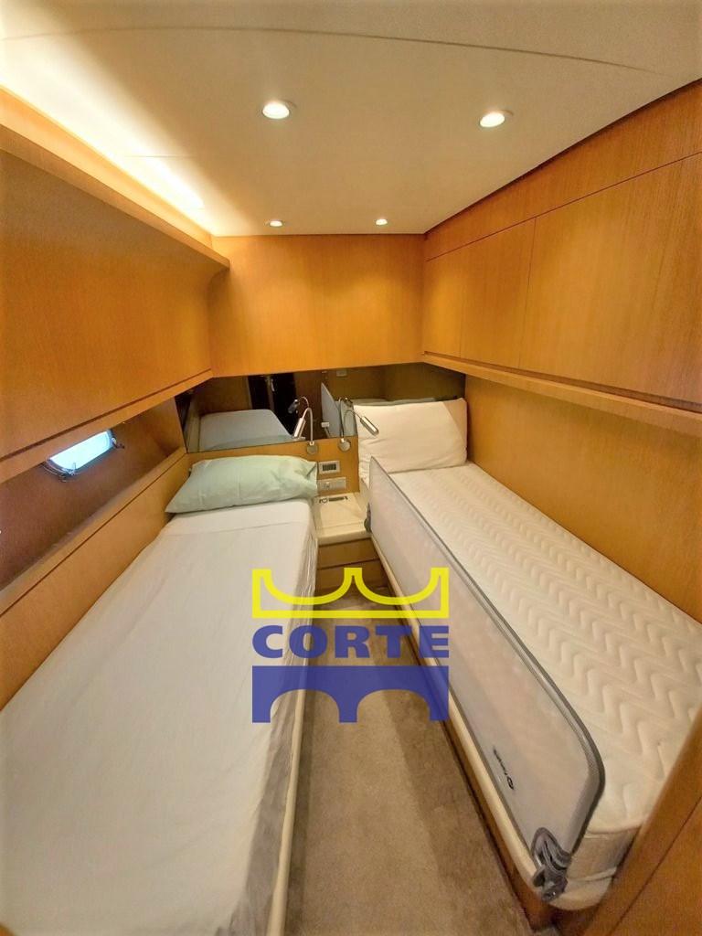 Engine Alarm, Bilge Alarm, Spare shaft, Water pressure pump, Draining System, Teak Side Decks, Shore power cable, Deck Shower, Twin Steering, Directional Spotlight, Hydraulic Flaps, Davits for tender on fly, Fire Extinguishing System, Anchor Chain Washdown, Courtesy Lights (pozzetto, fly e camminamenti laterali), Battery Monitor, Gangway (idraulica a scomparsa Besenzoni), Platform (di poppa apribile elettricamente), Automatic Bilge Pump, Manual Bilge Pump, Teak deck, Entry door, Side door, Teak Cockpit, Shorepower connector, Water harbor connector system, Electric Windlass, swimming ladder, cockpit table, Tender (Surmarine (motore nuovo)), Horn, 2 Stern Winches, Bow Winches.