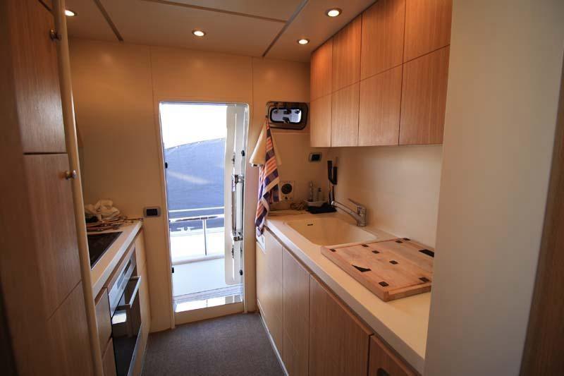 Galley, Deck Refrigerator, Washer dryer, Ceramic hot plate.