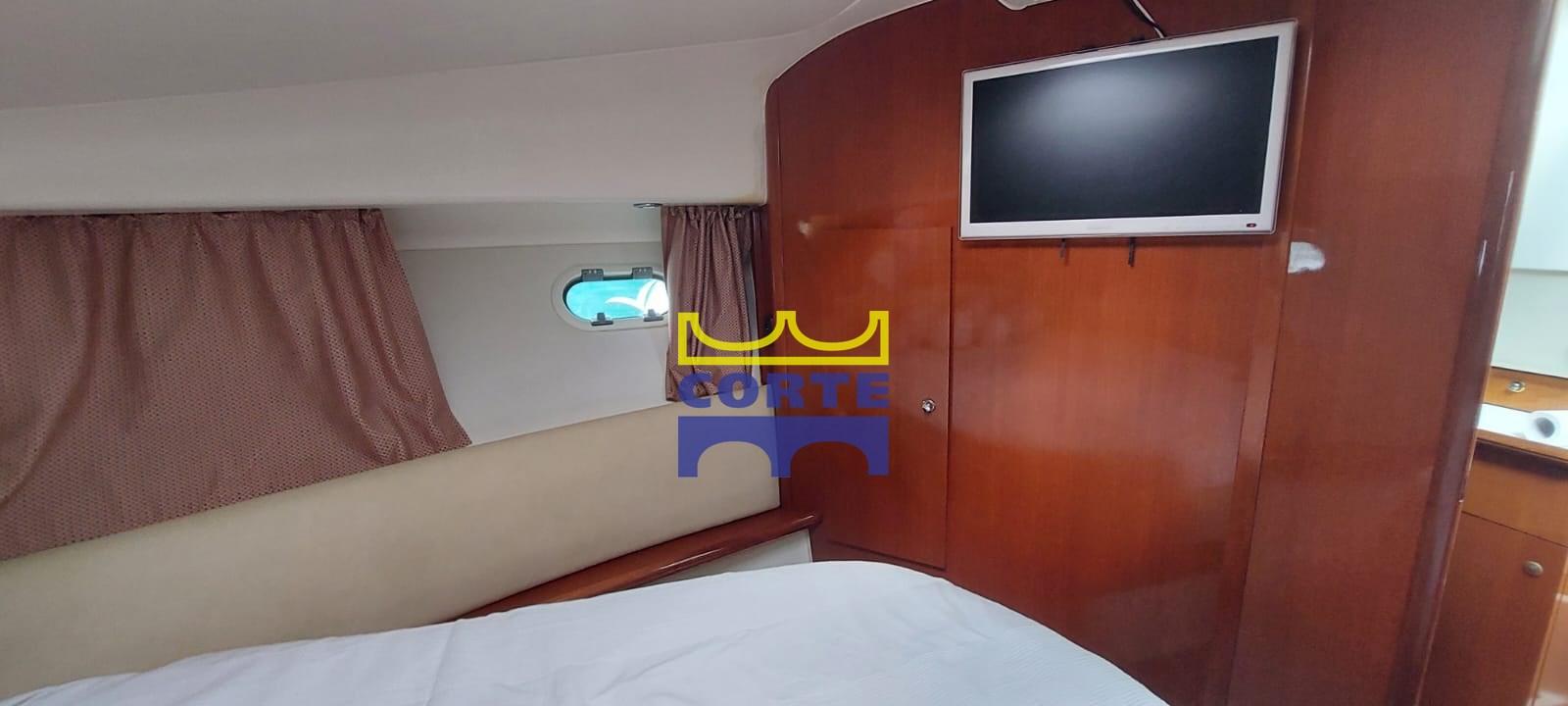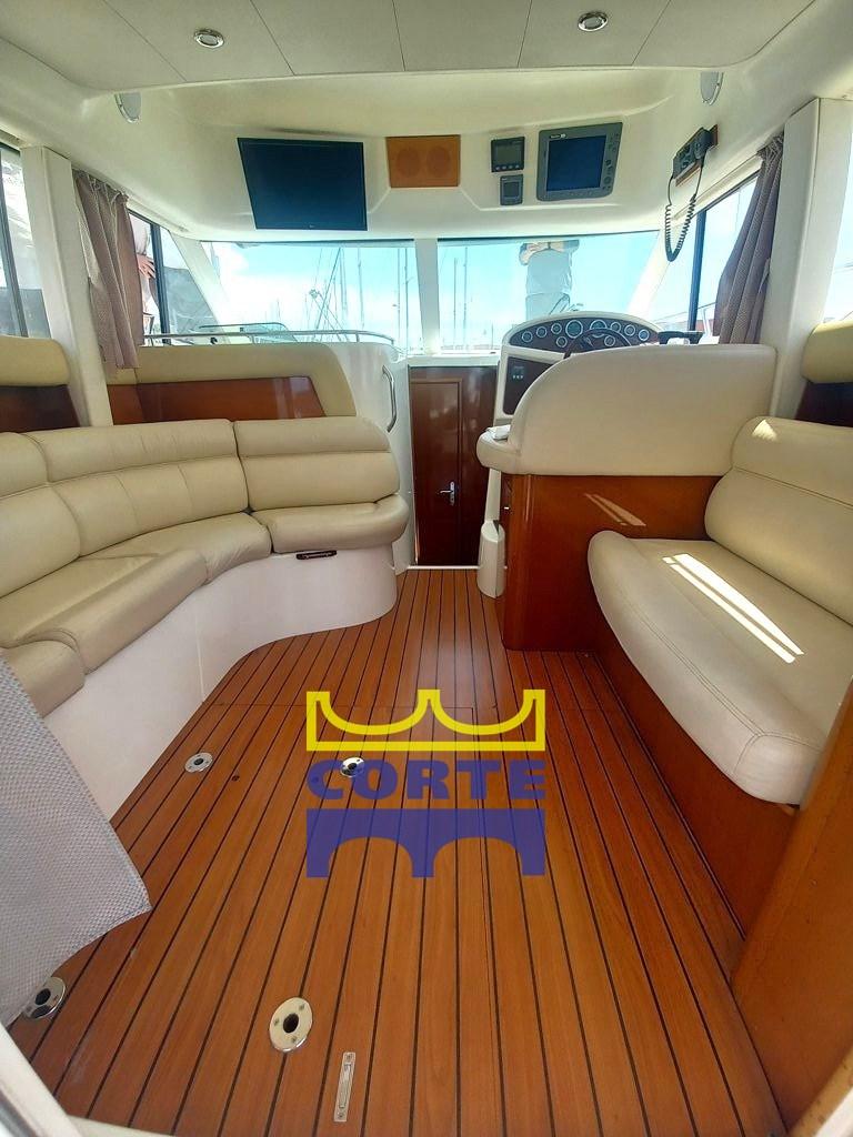 Engine Alarm, Water pressure pump, 5 Batteries, Battery charger (25 A), Deck Shower, Twin Steering, Electric Flaps, Tender Crane (passerella), Courtesy Lights, Gangway (idraulica), Platform (strutturale poppa in teak), Automatic Bilge Pump, Manual Bilge Pump, Entry door, Teak Cockpit, Shorepower connector, Electric Windlass, swimming ladder, Bow Winches.