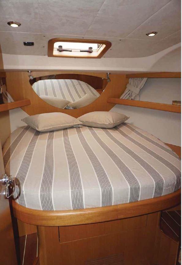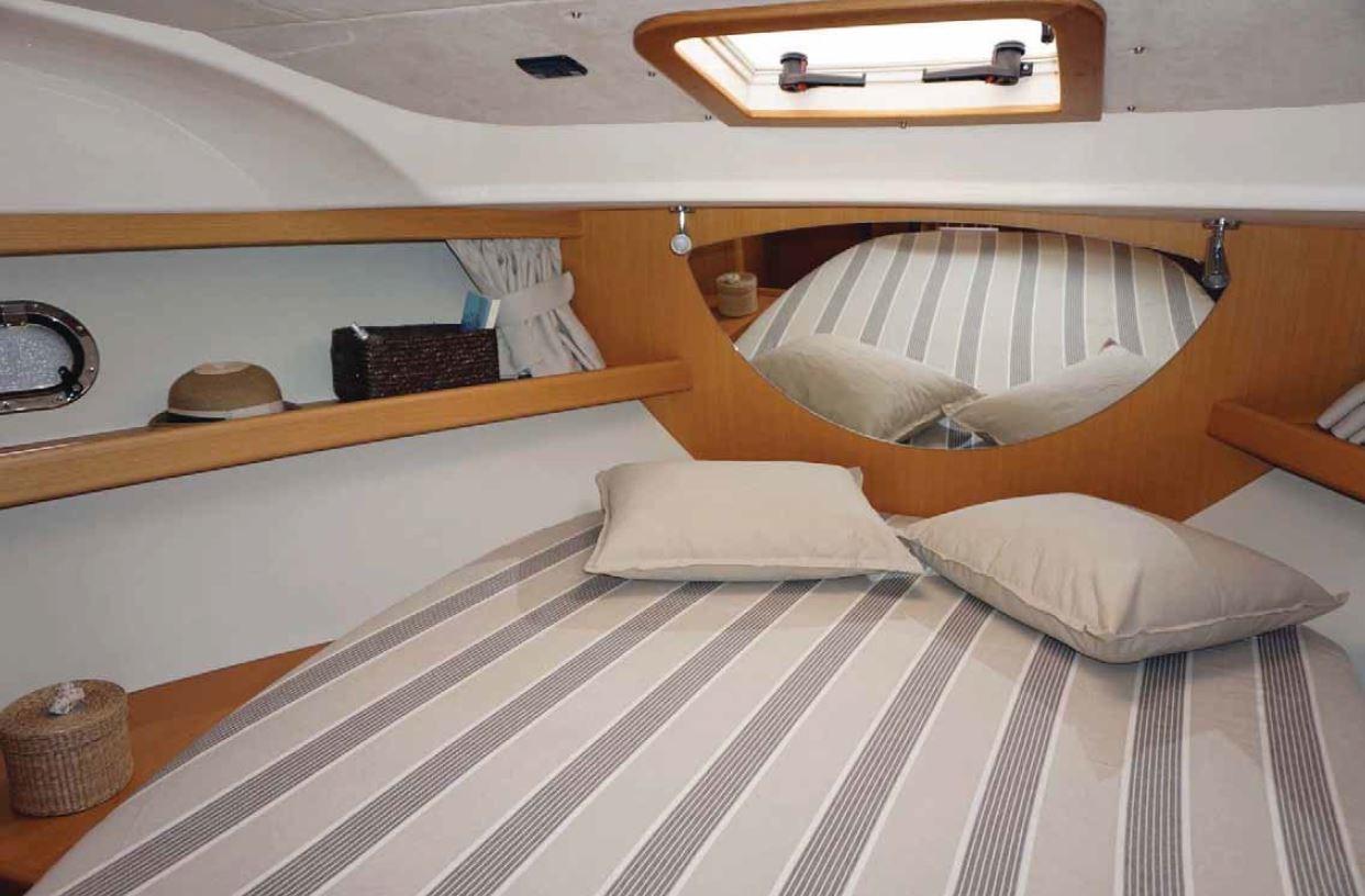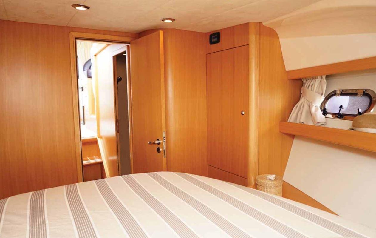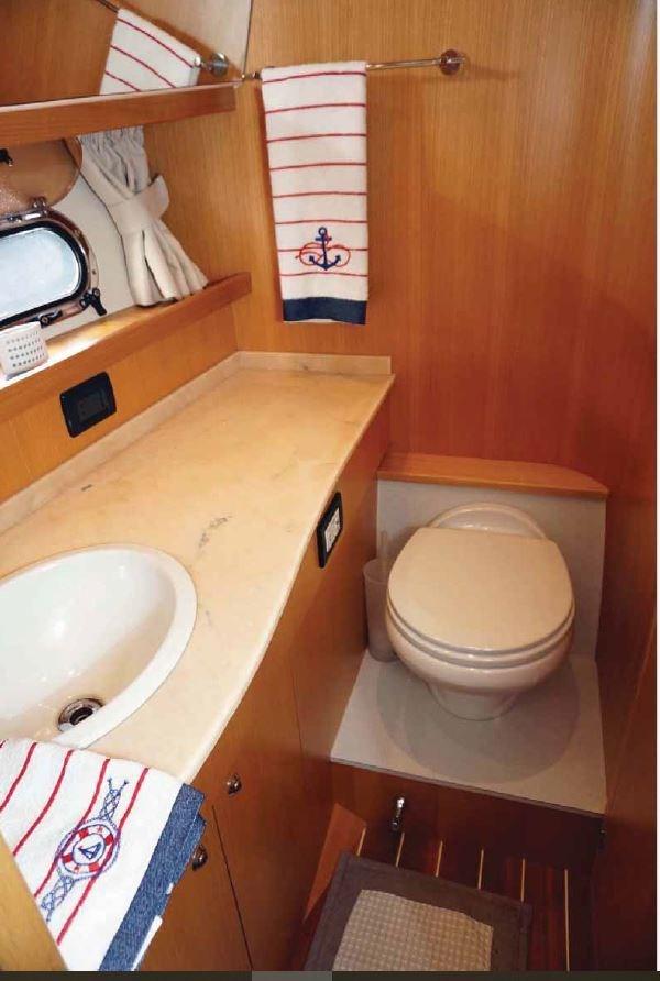 the single beds in the guest cabin can be converted into a double bed, with the special support and attached mattress supplied; the dinette sofa can be converted into a double bed with the special mattress supplied; glass shower compartment door; electric toilet with macerator powered by fresh water;
