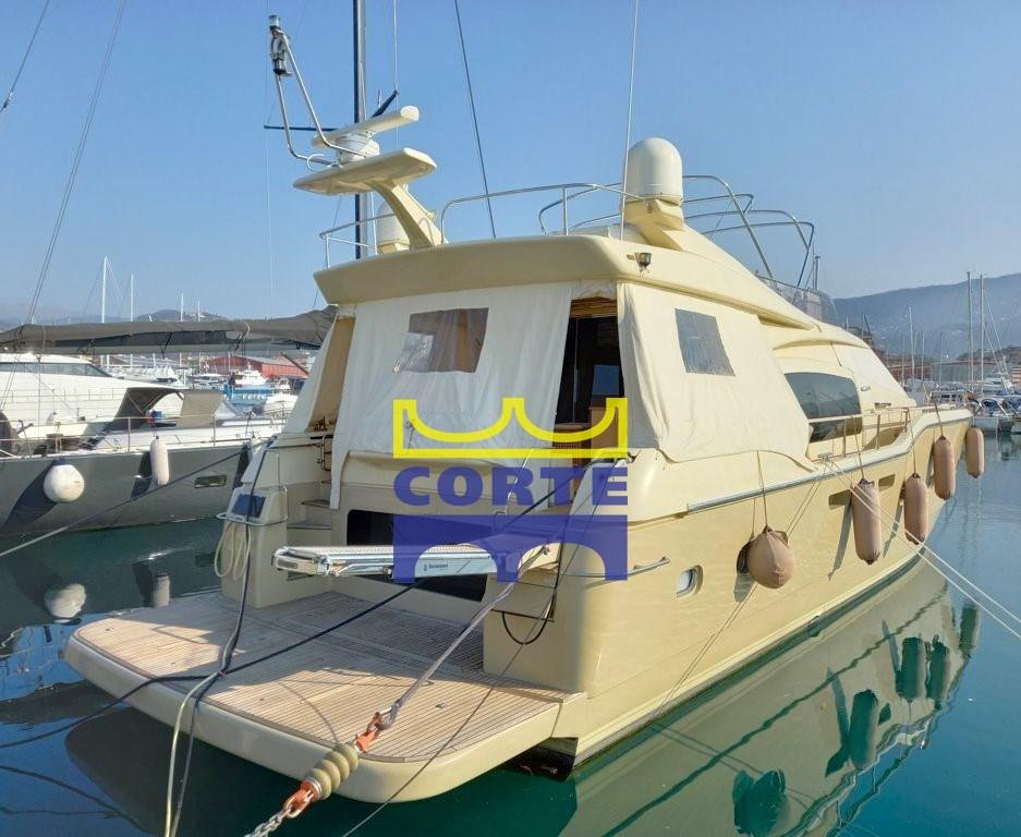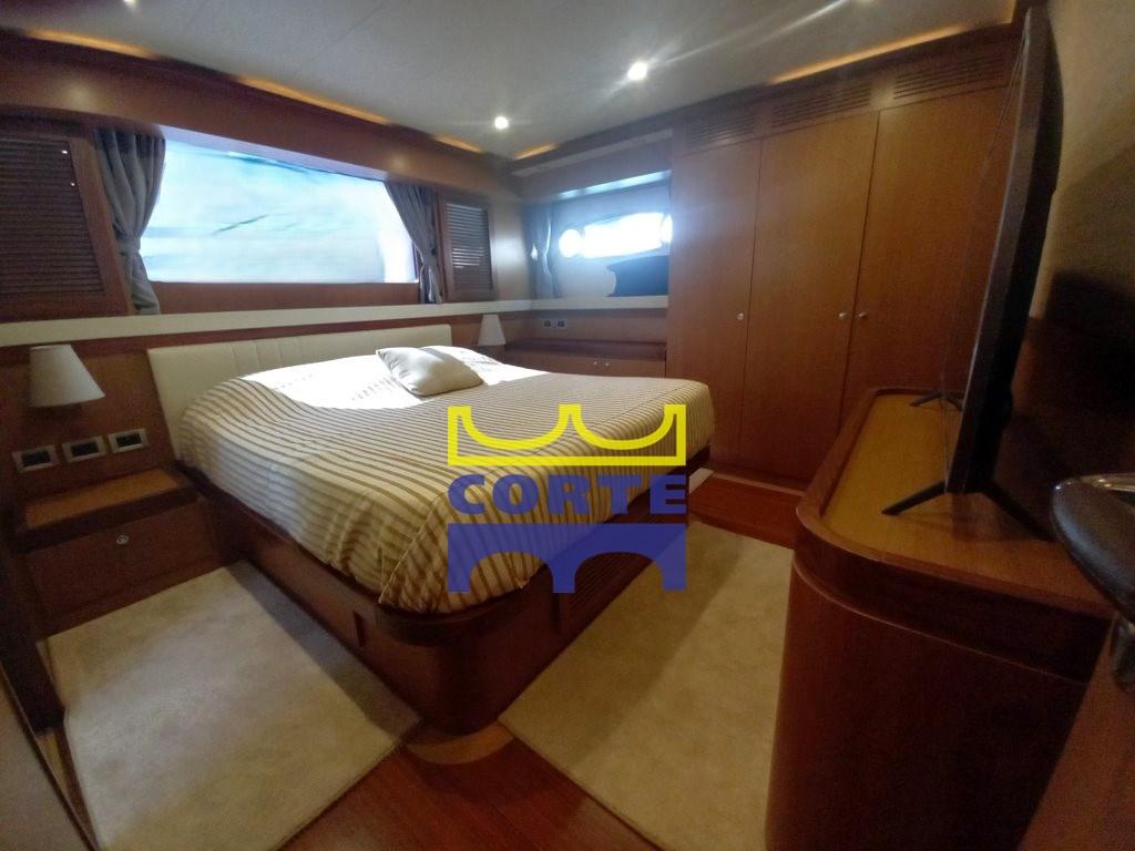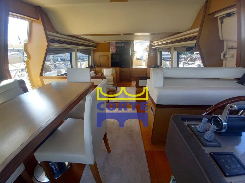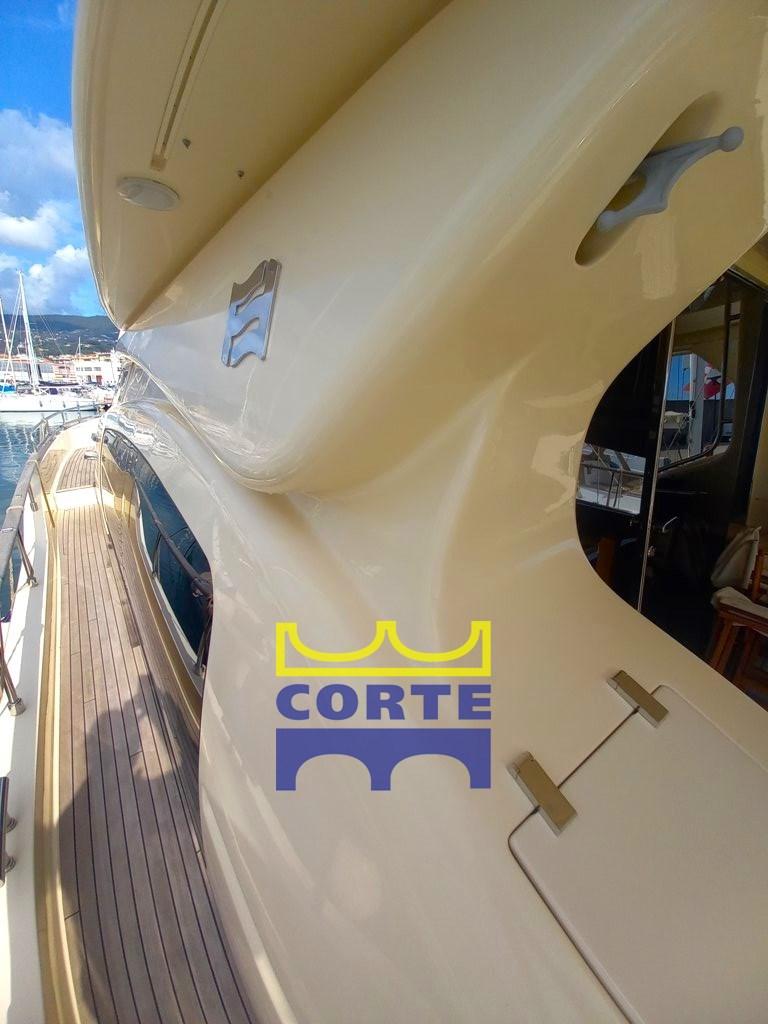 gyroscopic stabilizers, third helm station in the cockpit, teak stern platform (tender lift), telescopic table in the bow with sundeck, watertight lights under the platform, side opening of the pulpit, double Roman blinds in the saloon, side walkway light, 26" LCD TV with electric lift, drawer freezer, amplified speakers in pairs on the flybridge, empty dome, extractor hood above kitchen burners, complete deckhouse-colored external cushion covers.