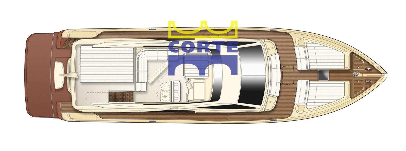Two sundecks have been positioned on the flying bridge, one very wide towards the stern and one towards the bow next to the helm station. L-shaped sofa, fixed table and fridge and grill area complete the fly.