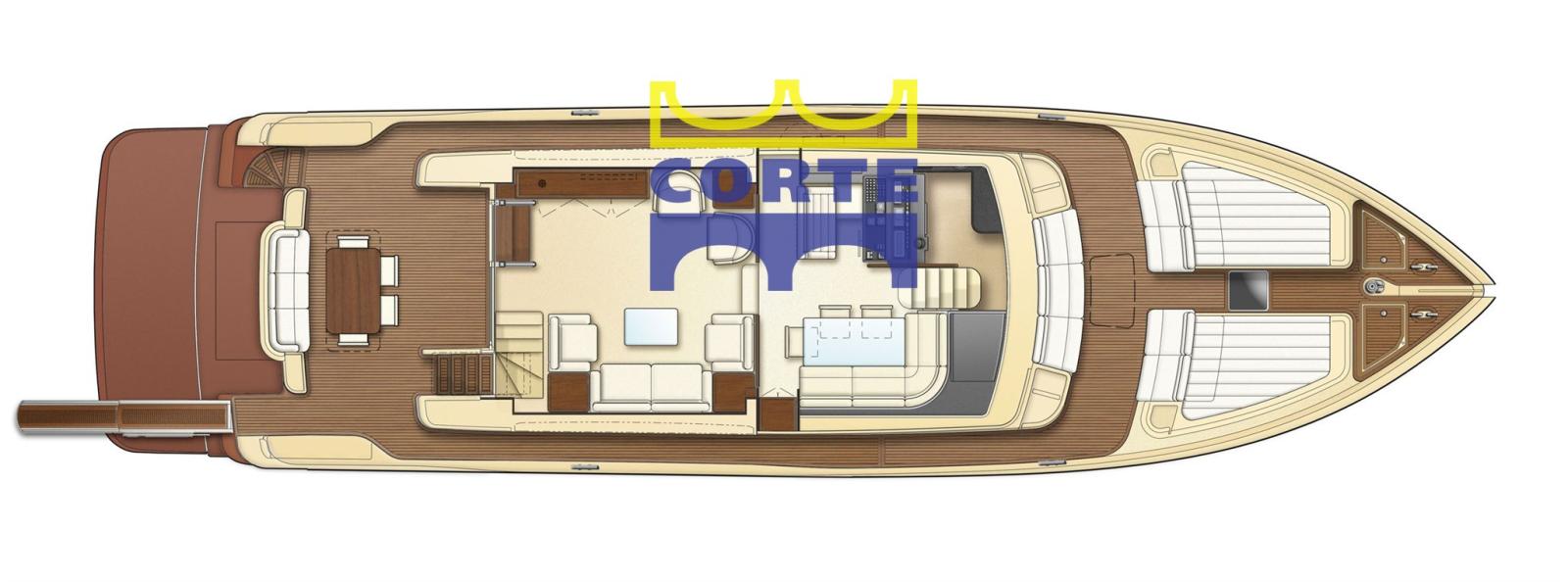 Going up two steps, the bow saloon develops where on the left is the helm station with a low sofa and on the right the dining area with teak table that can accommodate up to eight people. In the middle of the saloon, two convenient exits on both sides allow you to reach the external walkway to access the stern and bow living areas, a typical solution for larger yachts.